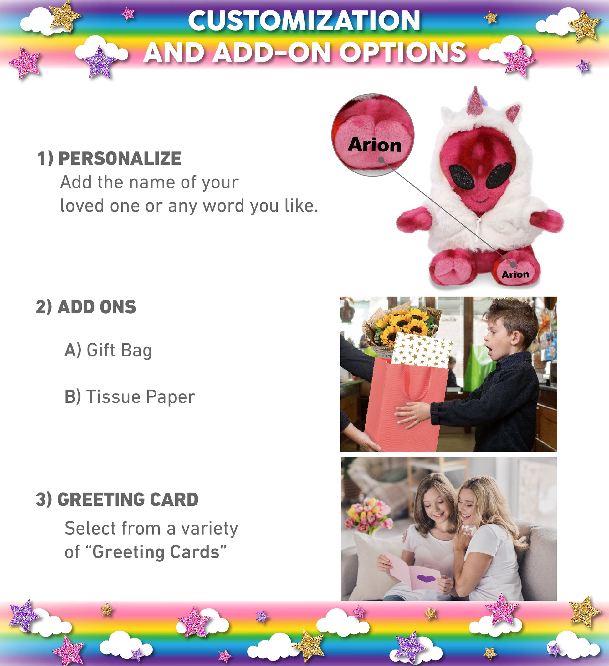 PERSONALIZATION, CUSTOMIZATION, AND ADD-ON OPTIONS - The Super Soft Plush Pink Tie-Dye Alien Unicorn Stuffed Doll comes customized with a White Unicorn outfit. You can personalize it with the name of your loved one, and we will imprint it on the item. You also have the option to add some or all of the cute add-ons to make it extra special: 1) Gift Bag; 2) Tissue Paper; 3) Greeting Card.