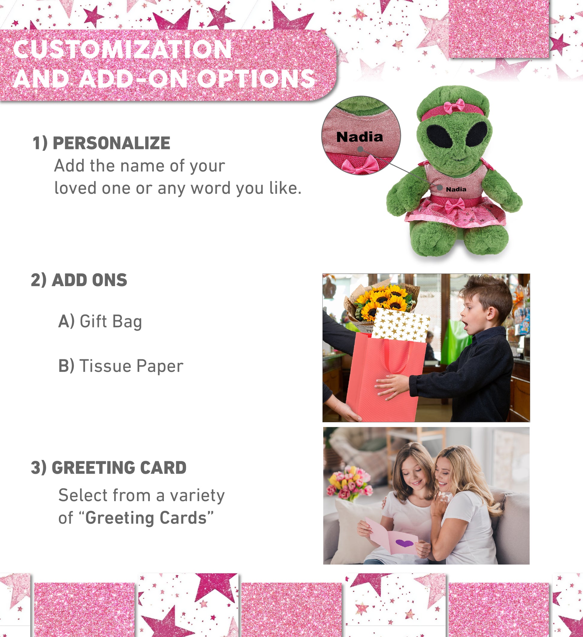 Personalization, Customization, and Add-On Options - The alien plush toy comes dressed in a charming pink ballerina outfit, complete with tutu skirt, headband, and shirt. Make it meaningful by personalizing it with the name, which we will imprint directly onto the plush. You can also customize your ballerina alien stuffed animal doll by adding any of our add-ons to create the perfect gift: 1) Gift Bag 2) Tissue Paper 3) Greeting Card.
