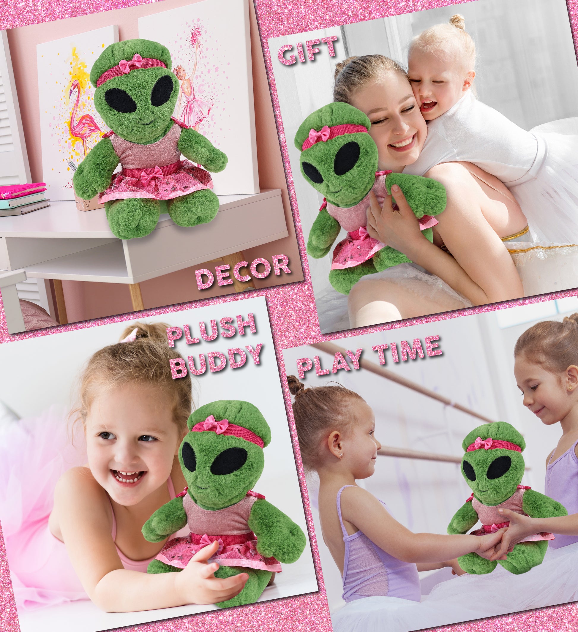 Ballerina-Themed Stuffed Animal Alien Doll Features a Unique Combination of Space and Ballet - It features a cute alien plush with adorable pink ballerina clothes. The stuffed animal alien plush toy features a soft plush all over and a set of pink ballerina dress complete with a pink ribbon headband, tutu skirt, and a sleeveless top, making it a cute ballerina stuffy doll little dancers will enjoy to play and collect.