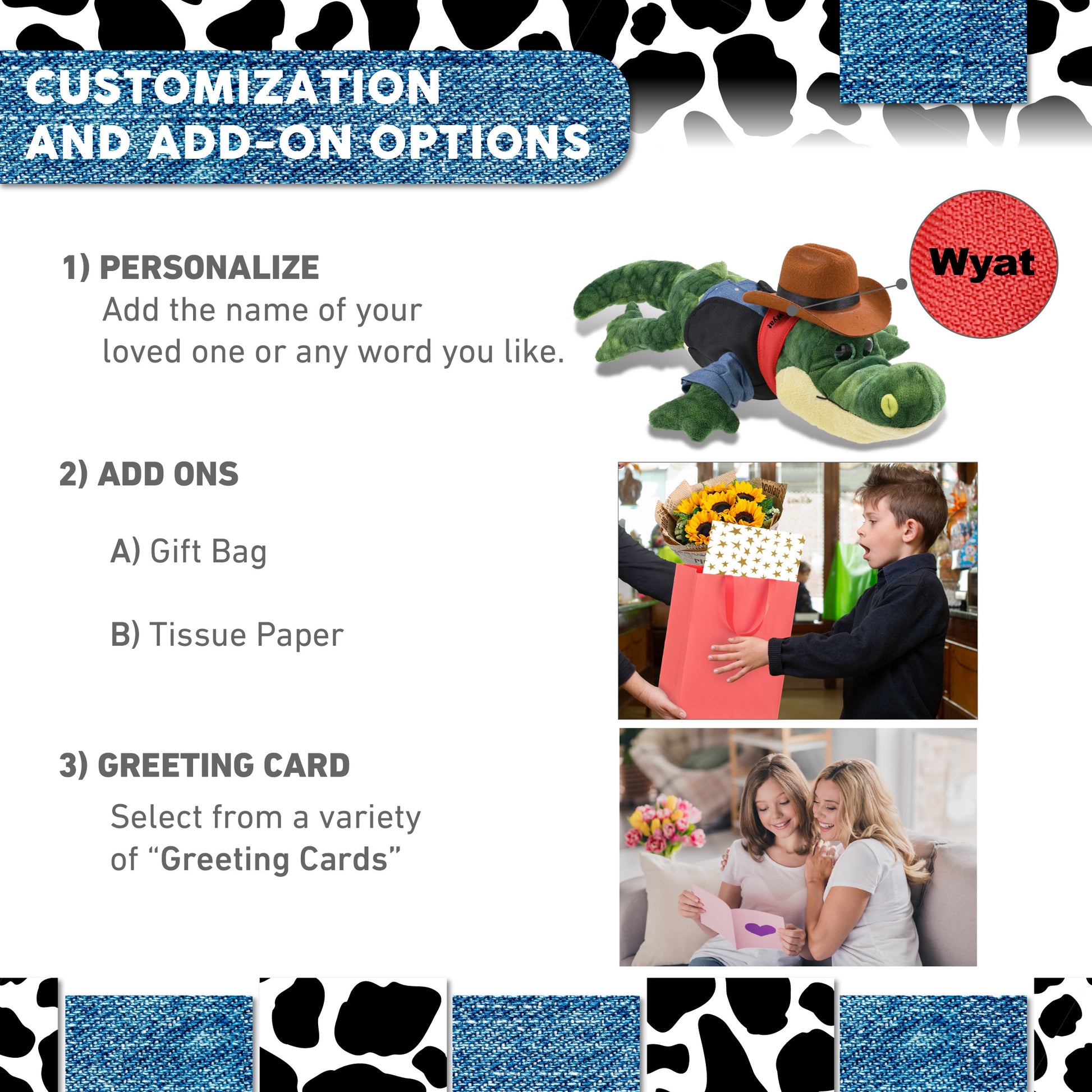 Personalization, Customization and Add-On Options - The alligator stuffed animal plush comes dressed in a cowboy outfit, complete with cowboy vest shirt, pants, bandana, and cowboy hat. Make it cool by personalizing it with the name, which we will imprint directly onto the stuffy plush. You can also customize your cowboy plush gator by adding any of our add-ons to create the perfect gift: 1) Gift Bag 2) Tissue Paper 3) Greeting Card.