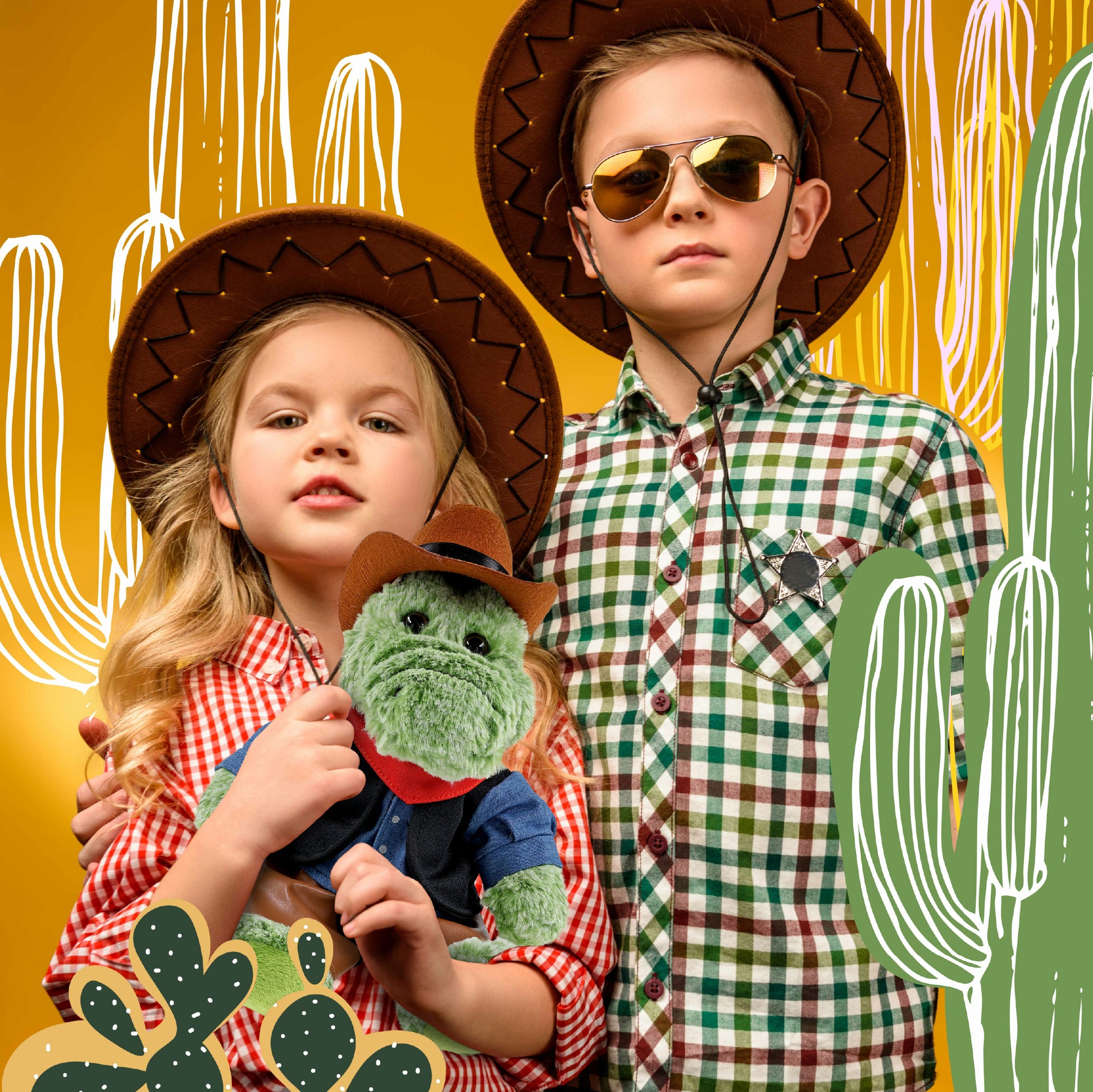 Includes 1 DolliBu Sitting Alligator Toy with Cowboy Dress Up Set - This alligator plush arrives with cowboy plush clothes. The cute stuffed toy features a cowboy costume hat, vest shirt, red handkerchief, and brown chaps. Whether you collect adorable stuffed animals or gifts for cowboys with cowboy stuffed animal clothes, this teddy bear plush toy is the perfect cowboy gift. It measures 7Lx6Wx8H inches and is best for kids ages 3 and up.