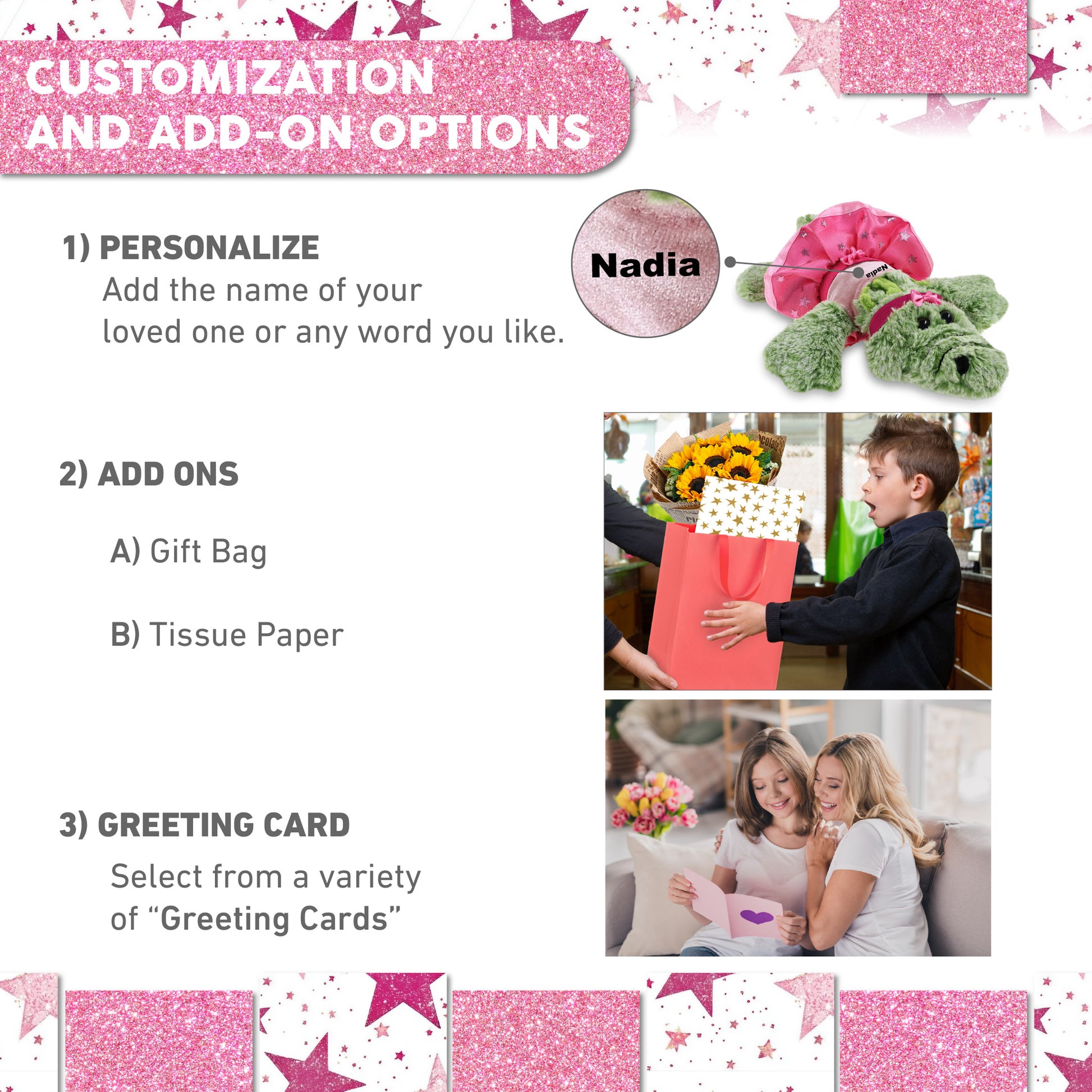 Personalization, Customization, and Add-On Options - The alligator plush toy comes dressed in a charming pink ballerina outfit, complete with tutu skirt, headband, and shirt. Make it meaningful by personalizing it with the name, which we will imprint directly onto the plush. You can also customize your ballerina alligator stuffed animal doll by adding any of our add-ons to create the perfect gift: 1) Gift Bag 2) Tissue Paper 3) Greeting Card.