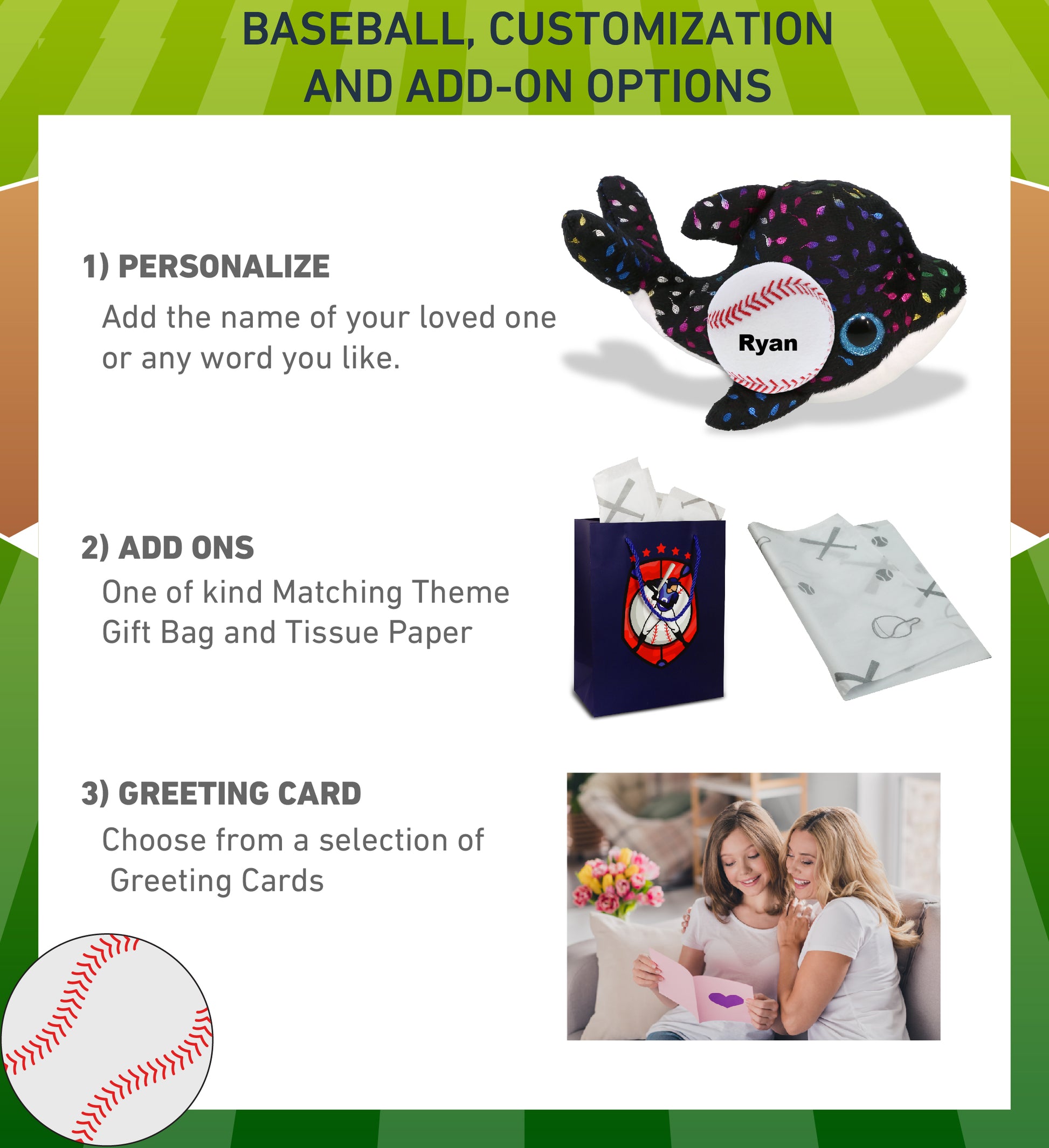 Personalization, Customization, and Add-On Options - The Super Soft Sports Stuffed Animal Big Eye Orca Whale comes customized with a small baseball plush. You can personalize your stuffed animal orca whale with the name of your loved one which we will imprint on the item. You also have the option to add some or all of the cool add-ons to make your gift extra special: 1) Gift Bag; 2) Tissue Paper; 3) Greeting Card.