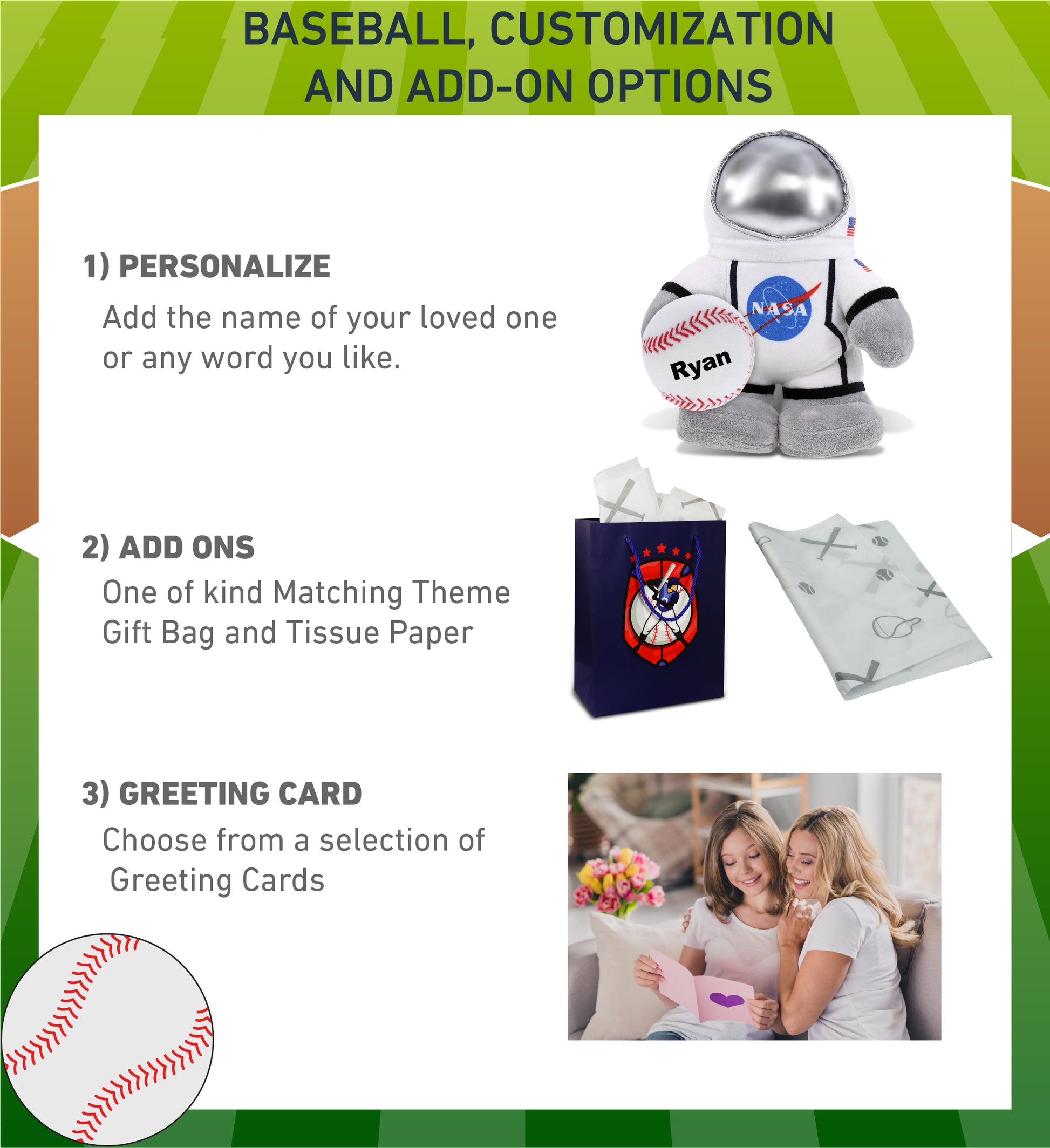 Personalization, Customization, and Add-On Options - The Snug-Mooshies Super Soft Sports Stuffed Animal Standing Astronaut comes customized with a small baseball plush. You can personalize your stuffed astronaut with the name of your loved one which we will imprint on the item. You also have the option to add some or all of the cool add-ons to make your gift extra special: 1) Gift Bag; 2) Tissue Paper; 3) Greeting Card.