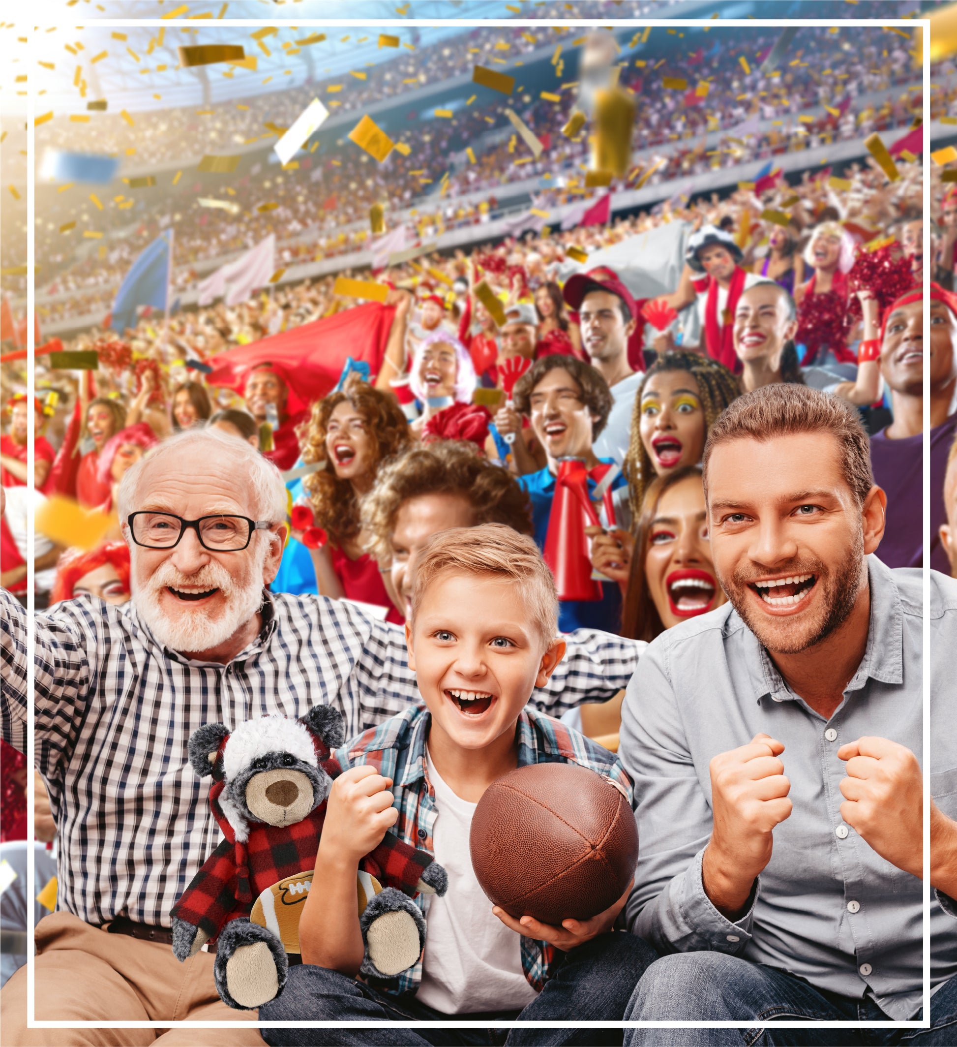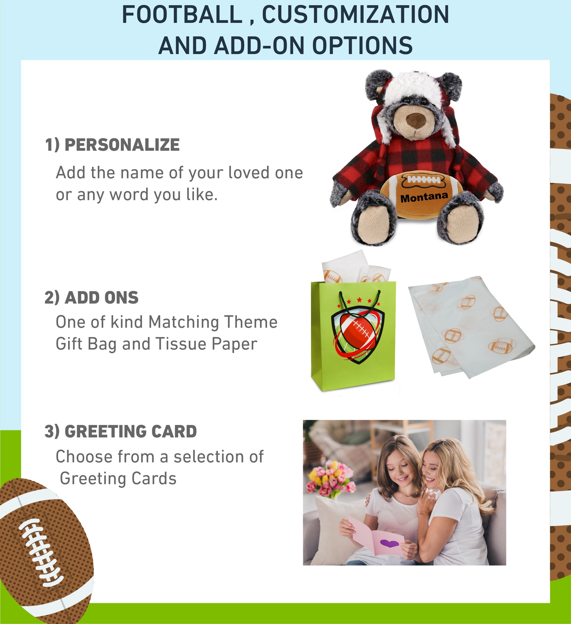 Personalization, Customization, and Add-On Options - This Super Soft Sports Stuffed Animal Red Plaid Outfit Black Bear Plush comes customized with a football plush. You can personalize it with the name of your loved one imprinted on the item. You also have the option to add some or all of the cool add-ons to make your gift extra special: 1) Gift Bag; 2) Tissue Paper; 3) Greeting Card.