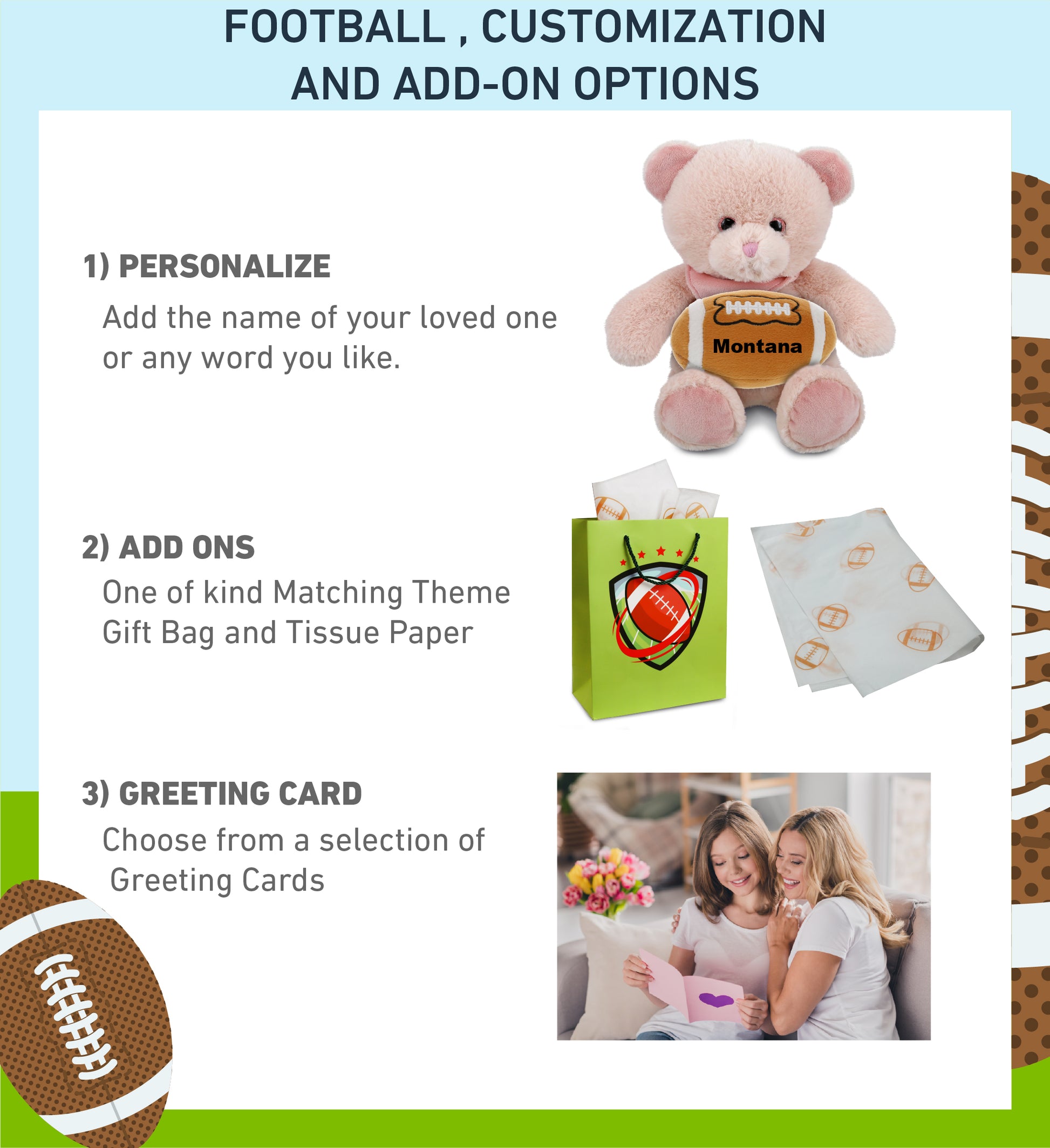 PERSONALIZATION, CUSTOMIZATION, AND ADD-ON OPTIONS - Super Soft Sports Stuffed Animal Baby Pink Bear comes customized with a Football Plush. You can personalize it with the name of your loved one imprinted on the item. You also have the option to add some or all of the cool add-ons to make your gift extra special: 1) Gift Bag; 2) Tissue Paper; 3) Greeting Card.