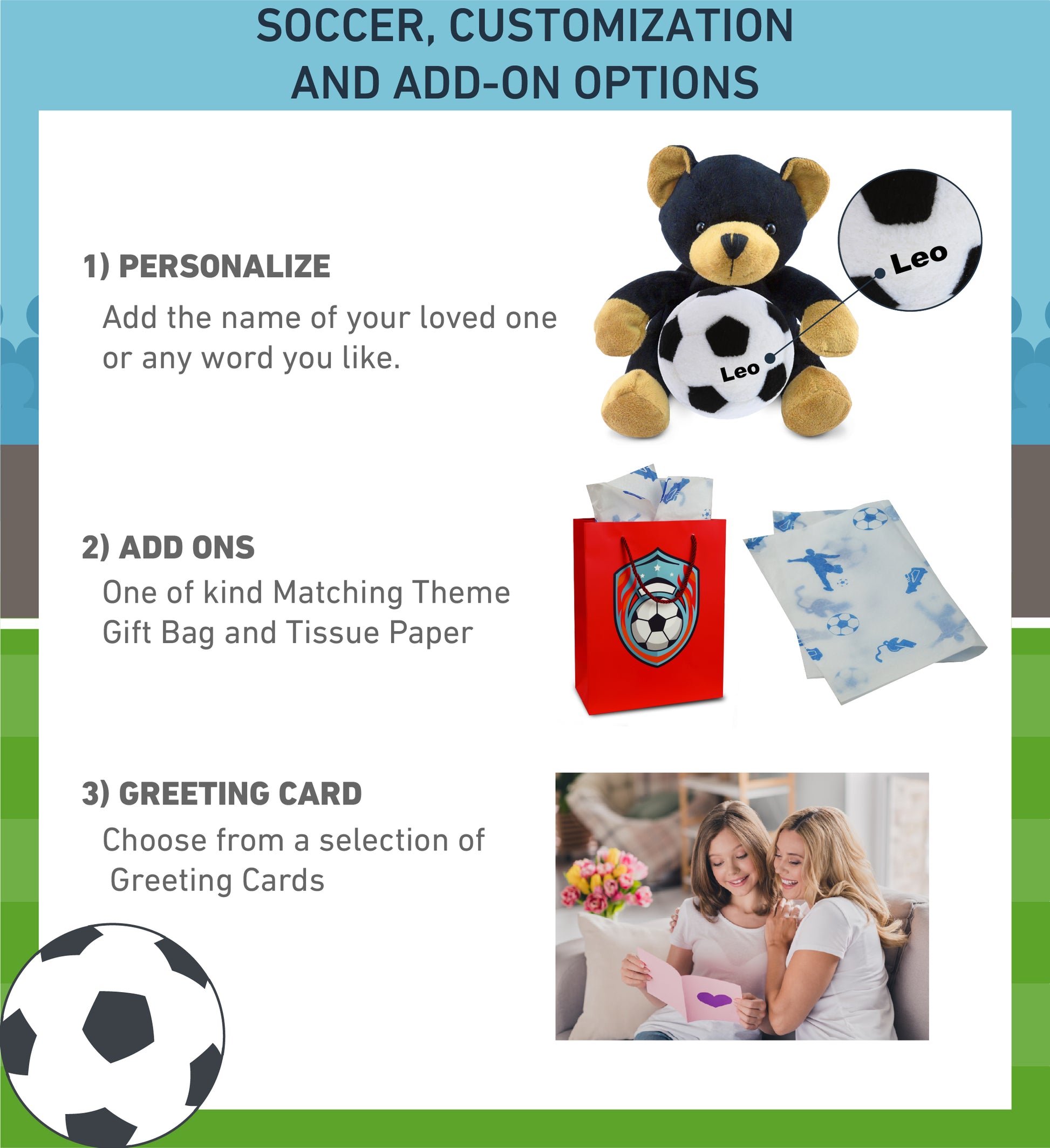 PERSONALIZATION, CUSTOMIZATION, AND ADD-ON OPTIONS - Super Soft Sports Stuffed Animal Black Bear comes customized with a Soccer Ball Plush. You can personalize it with the name of your loved one imprinted on the item. You also have the option to add some or all of the cool add-ons to make your gift extra special: 1) Gift Bag; 2) Tissue Paper; 3) Greeting Card.