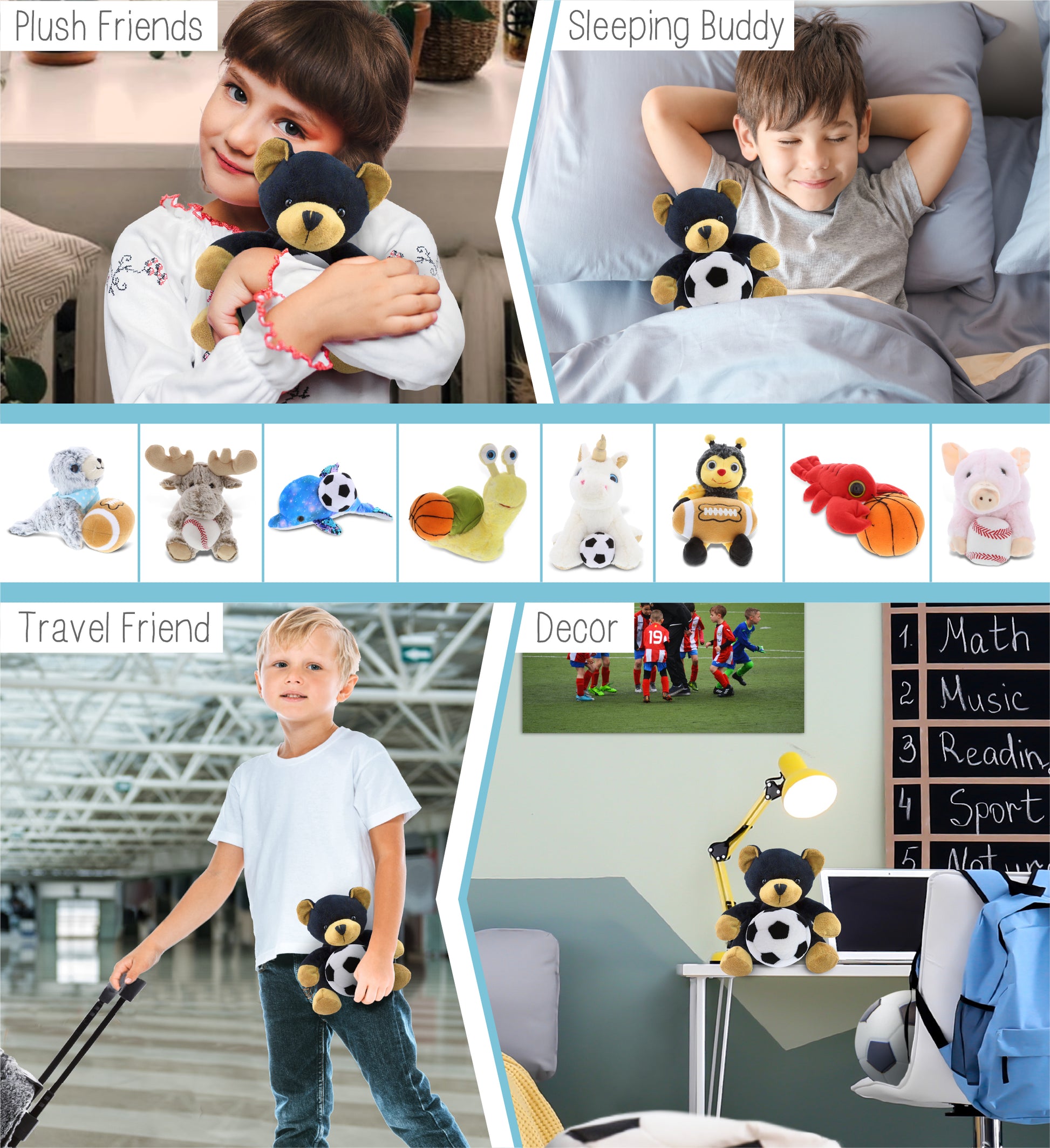 HIGH QUALITY SUPER SOFT PLUSH STUFFED ANIMAL - The machine-sewn black bear toy plush and soccer ball is made of premium-quality polyester, stuffed with soft fluffy polyester fillings. Made with durable and child-friendly features. Cute and snuggly black bear sitting down upright. Cute soft toys designed to be your little one's best buddies. To maintain fluffy stuffed animals, wash bear plush toys with cold soapy water and allow it to air dry.