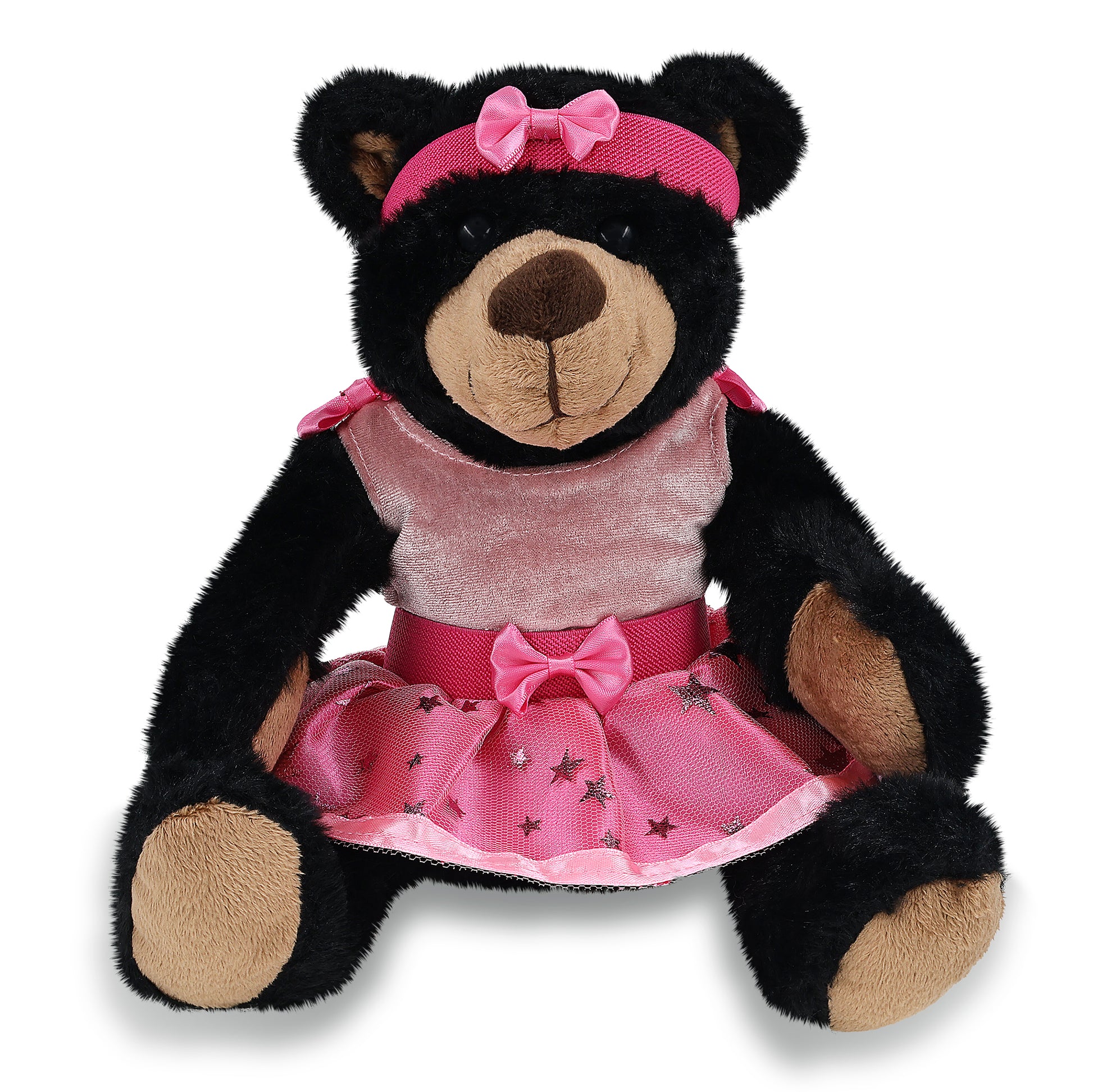 Black Bear with Ballet Stuffed Animal Clothes Features a Unique Combination of Wildlife and Ballet - This black bear plush ballet doll is wearing pink ballerina plush doll clothes. Perfect gift for ballerinas and dancers. The stuffed teddy bear features a soft plush and a set of ballet plush clothes, with a pink ribbon headband, tutu skirt, and a sleeveless top, making it a soft stuffed animal ballerina bear toy little dancers will enjoy.