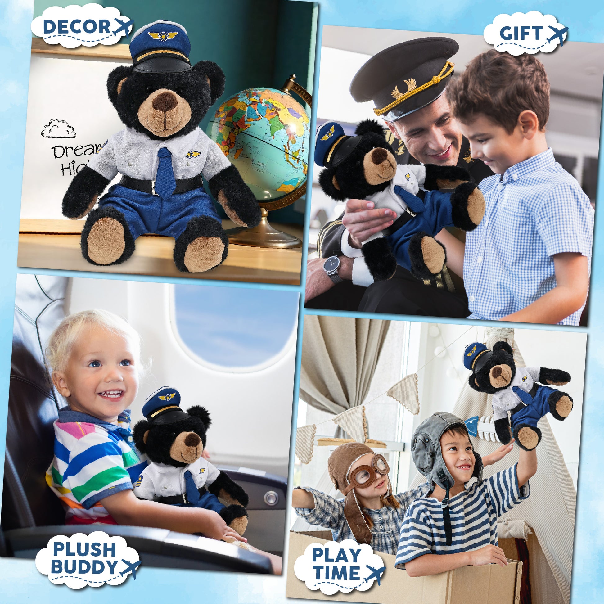 Features a Cute Teddy Bear Plush with Pilot Uniform Costume - This black bear doll features ready-to-fly pilot clothes for teddy bears. The black bear plush features cool details and realistic design, while the pilot career dress up costume features a white button-up aviation uniform shirt with printed pilot wings and sleeve stripes, blue pants with an elastic waistband, a black belt, a matching blue tie, and a classic pilot captain hat.
