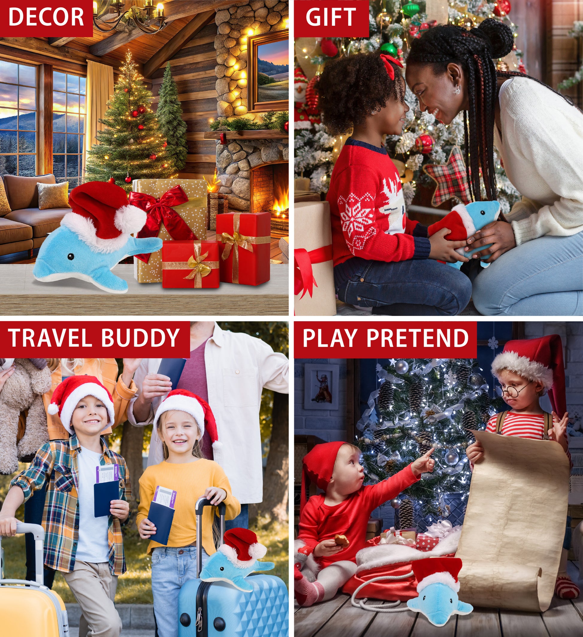 Ideal Use for the Dolphin Santa Claus Stuffed Animal - Send your warmest thoughts and best wishes to your loved ones with a cute Super Soft Dolphin plush during the holiday season and make the day extra special. Gifting a plush dolphin with a classic red Santa Claus hat is a cute way to share the joy of the holidays. Make occasions memorable by surprising him or her with a cute dolphin plush that can be displayed under their Christmas tree.