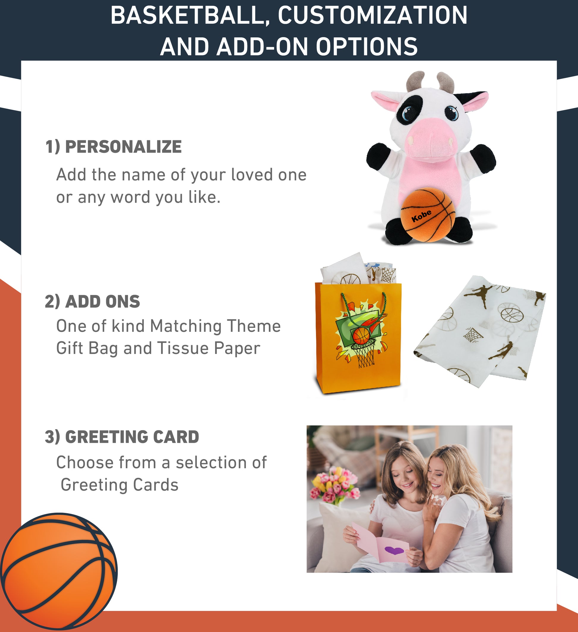 Personalization, Customization, and Add-On Options - The Snug-Mooshies Sports Stuffed Animal Standing Cow comes customized with a basketball plush. You can personalize your cow plush toy with the name of your loved one, which we will imprint on the item. You also have the option to add some or all of the cool add-ons to make your plush gift extra special: 1) Gift Bag; 2) Tissue Paper; 3) Greeting Card.