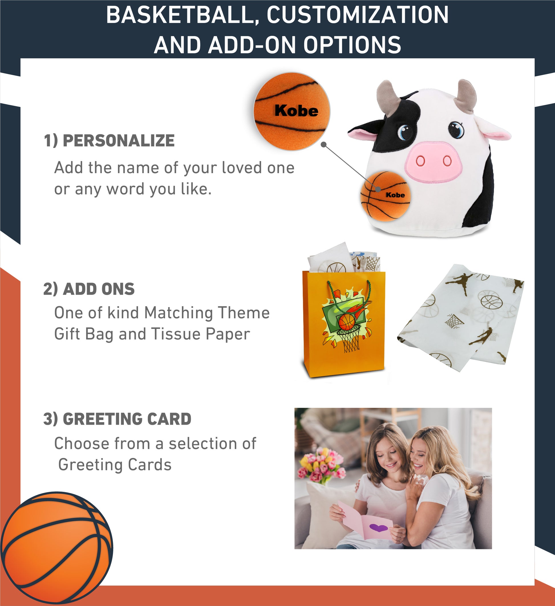Personalization, Customization, and Add-On Options - The Snug-Mooshies Sports Stuffed Animal Cow comes customized with a basketball plush. You can personalize your cow plush toy with the name of your loved one, which we will imprint on the item. You also have the option to add some or all of the cool add-ons to make your plush gift extra special: 1) Gift Bag; 2) Tissue Paper; 3) Greeting Card.