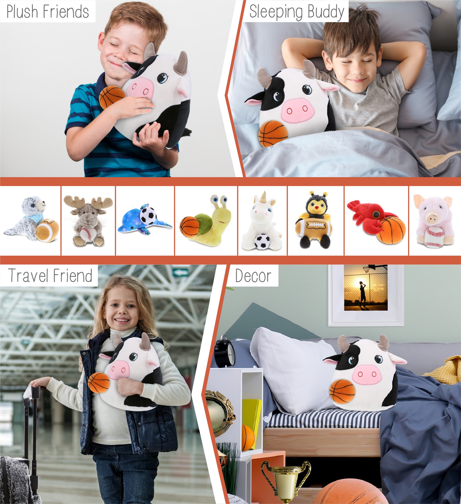 Included with the Purchase Of The Cute Cow Plush - Includes 1 DolliBu Snug-Mooshies Cow Plush with a basketball plush, decorated with realistic features of a cute plush animal. The cow's body with a sports gift ball plush makes the plush perfect for cuddles. The cow plush toy features details like its characteristic black spots. The cow's eyes make the critter so charming. The plush toy buddy measures 9Lx7Wx10H inches.