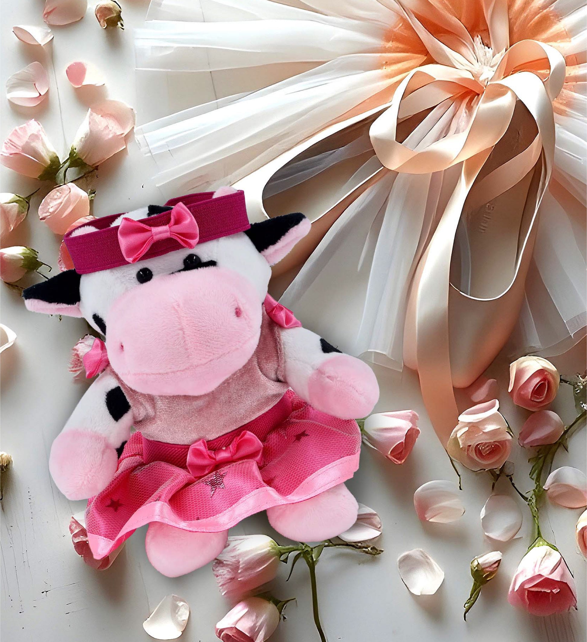 Ballerina-Themed Stuffed Animal Cow Doll Features a Unique Combination of Animals and Ballet - It features a cute cow plush with adorable pink ballerina clothes. The stuffed animal cow plush toy features a soft plush all over and a set of pink ballerina dress complete with a pink ribbon headband, tutu skirt, and a sleeveless top, making it a cute ballerina stuffy doll little dancers will enjoy to play and collect,