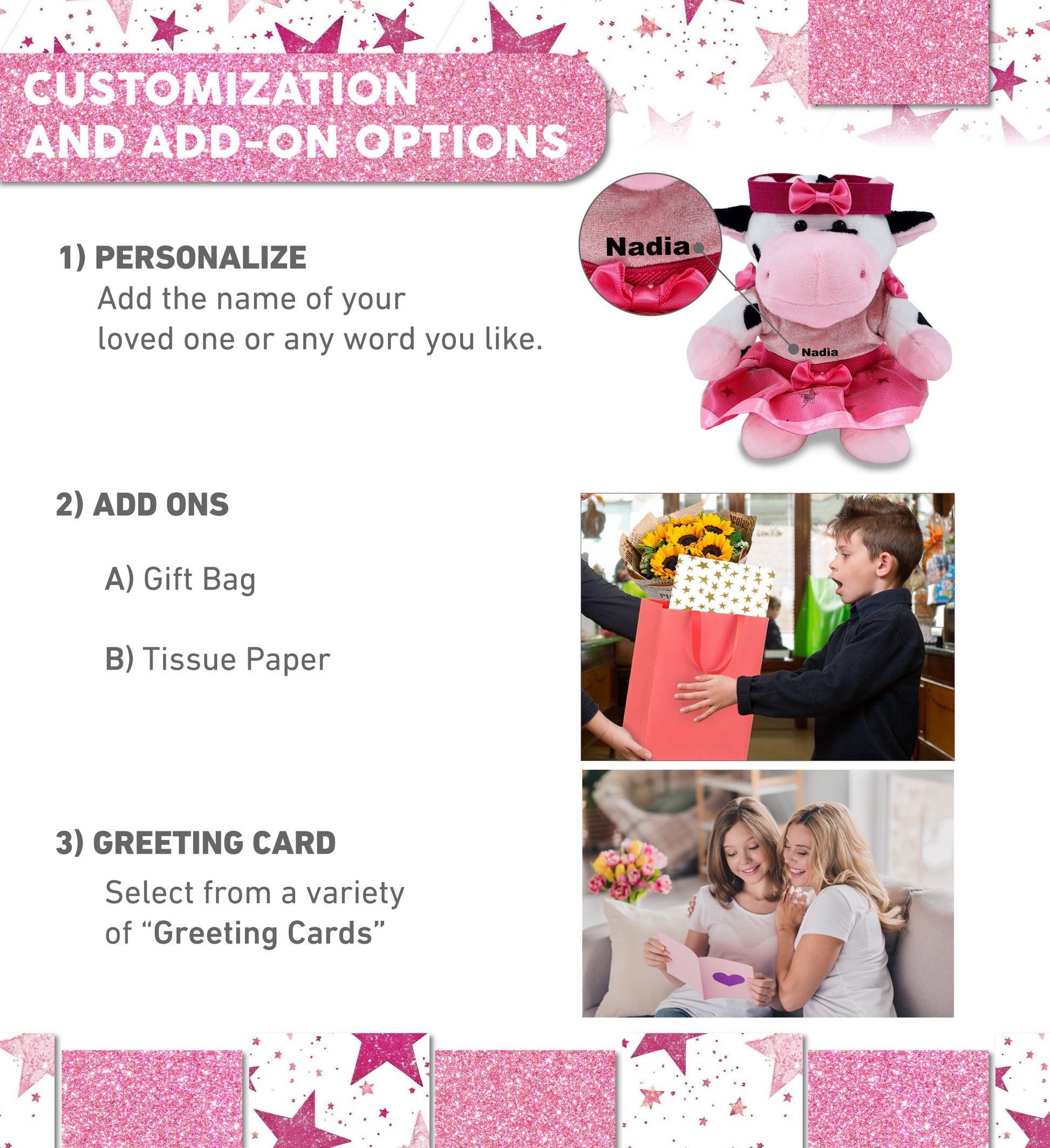 Personalization, Customization, and Add-On Options - The cow plush toy comes dressed in a charming pink ballerina outfit, complete with tutu skirt, headband, and shirt. Make it meaningful by personalizing it with the name, which we will imprint directly onto the plush. You can also customize your ballerina cow stuffed animal doll by adding any of our add-ons to create the perfect gift: 1) Gift Bag 2) Tissue Paper 3) Greeting Card.