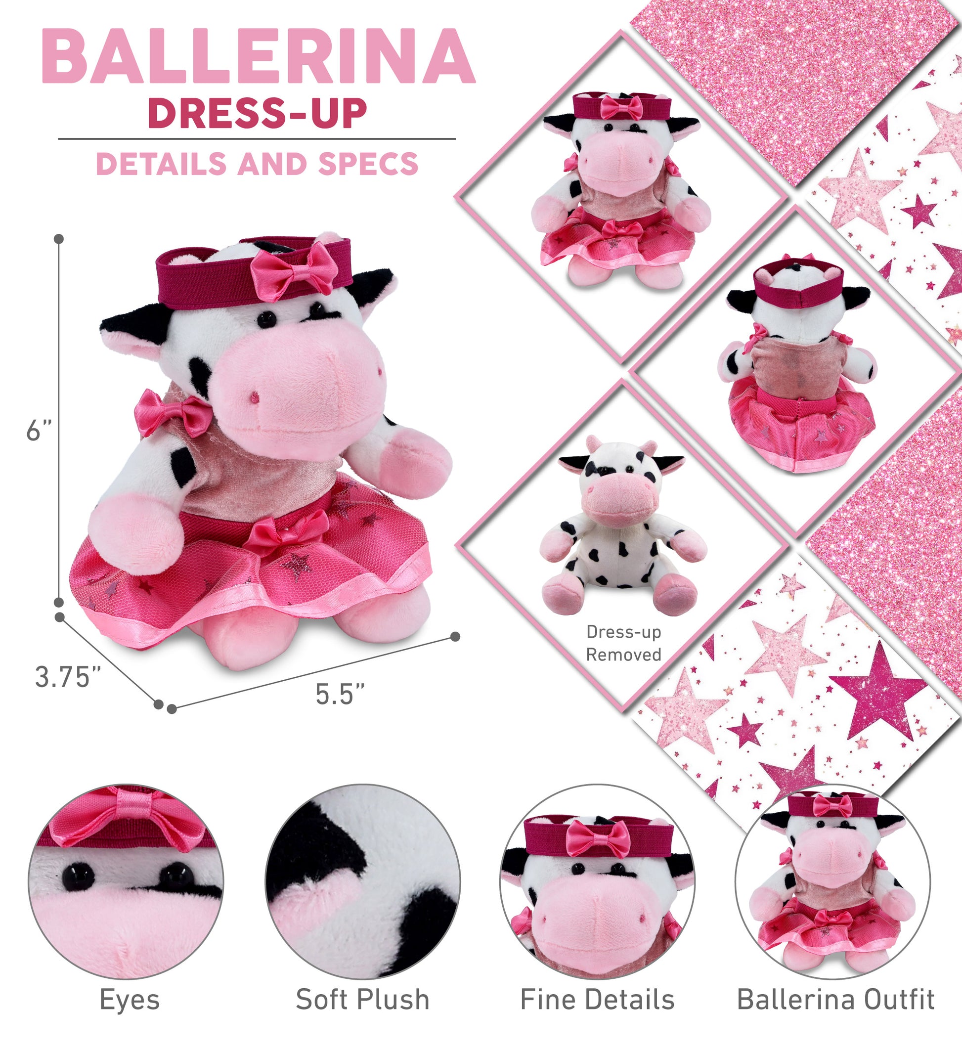 Includes 1 DolliBu Cow Toy with Ballerina Costume - Includes one adorable stuffed animal cow doll dressed in a cute ballerina doll plush outfit, complete with a pink headband with a bow, tutu skirt, and a sleeveless top. This cow figure ballerina toy is designed to be display-worthy and a cuddle plush for girls. This cute plush cow ballerina doll measures approximately 5.5Lx3.75Wx6H inches and is best for kids ages 3 and up.