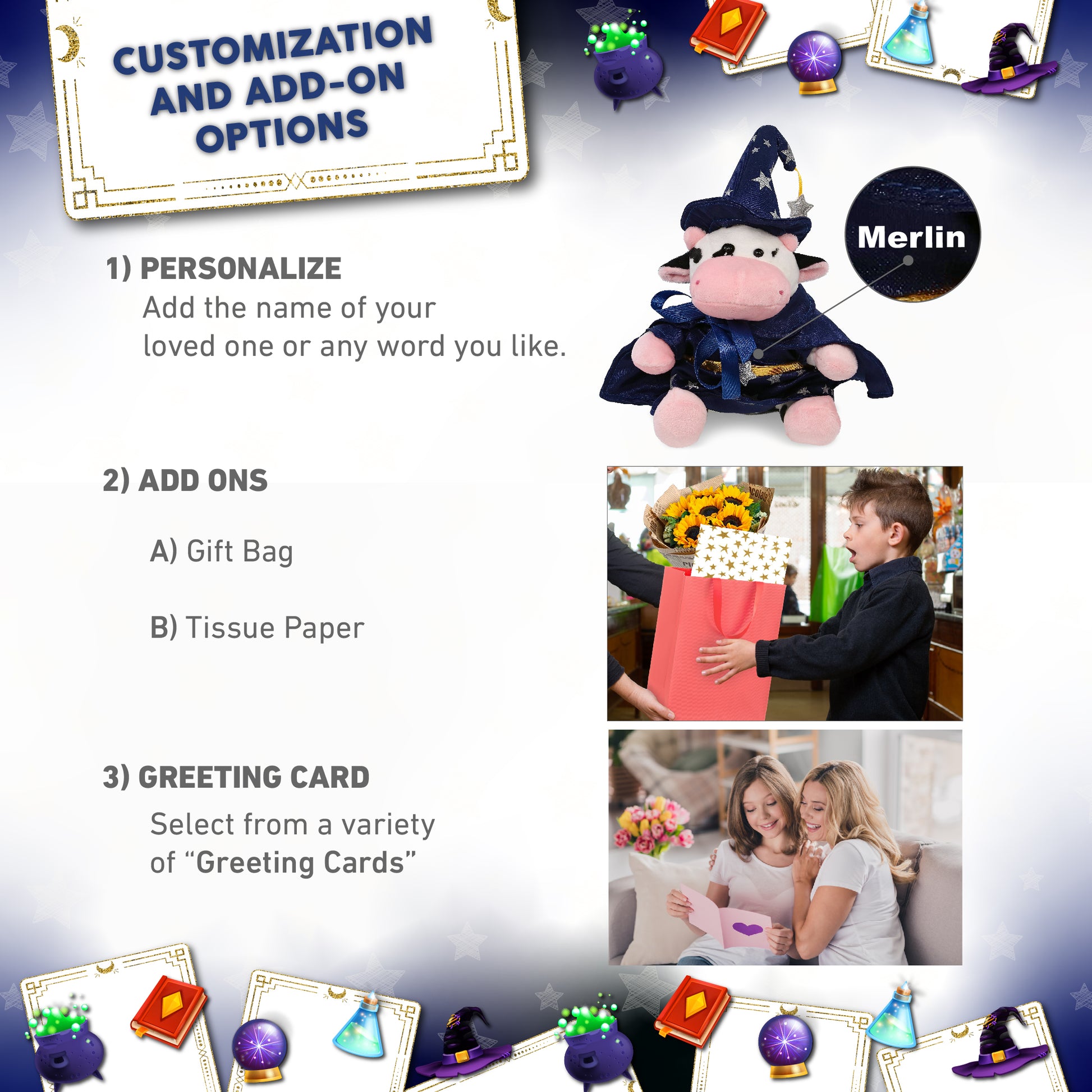 Personalization, Customization, and Add-On Options - The cow stuffed animal comes dressed in a complete wizard outfit, with a wizard cloak and hat with silver star details. Make your wizard stuffed cow special by adding a personalized name, which we will imprint onto the plush. You can customize your plush wizard toy by adding any of our add-ons to create the perfect gift: 1) Gift Bag 2) Tissue Paper 3) Greeting Card.
