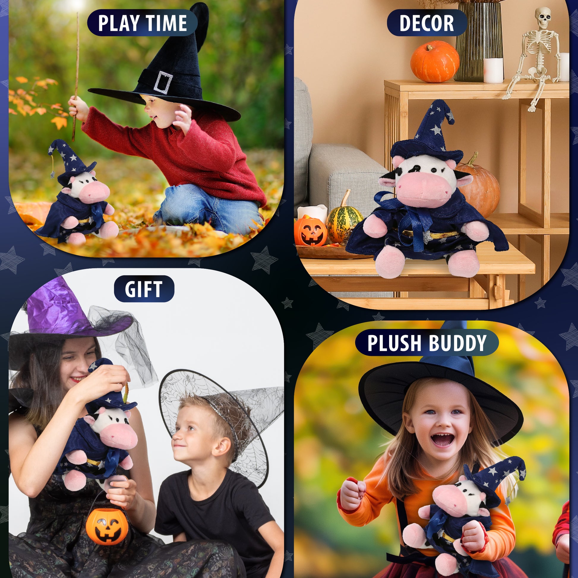 Features a Cute Cow Plush with Wizard Stuffed Animal Clothes - With a wizard cloak and wizard stuffed animal hat adorned with silver stars, this cow Halloween stuffed animal has a playful and stylish magical look! The detailed wizard fantasy outfit adds character to your stuffed toys and makes them stand out among other cute cow figures. Everyone will love to play with a huggable stuffed animal with wizard clothes for stuffed animals.