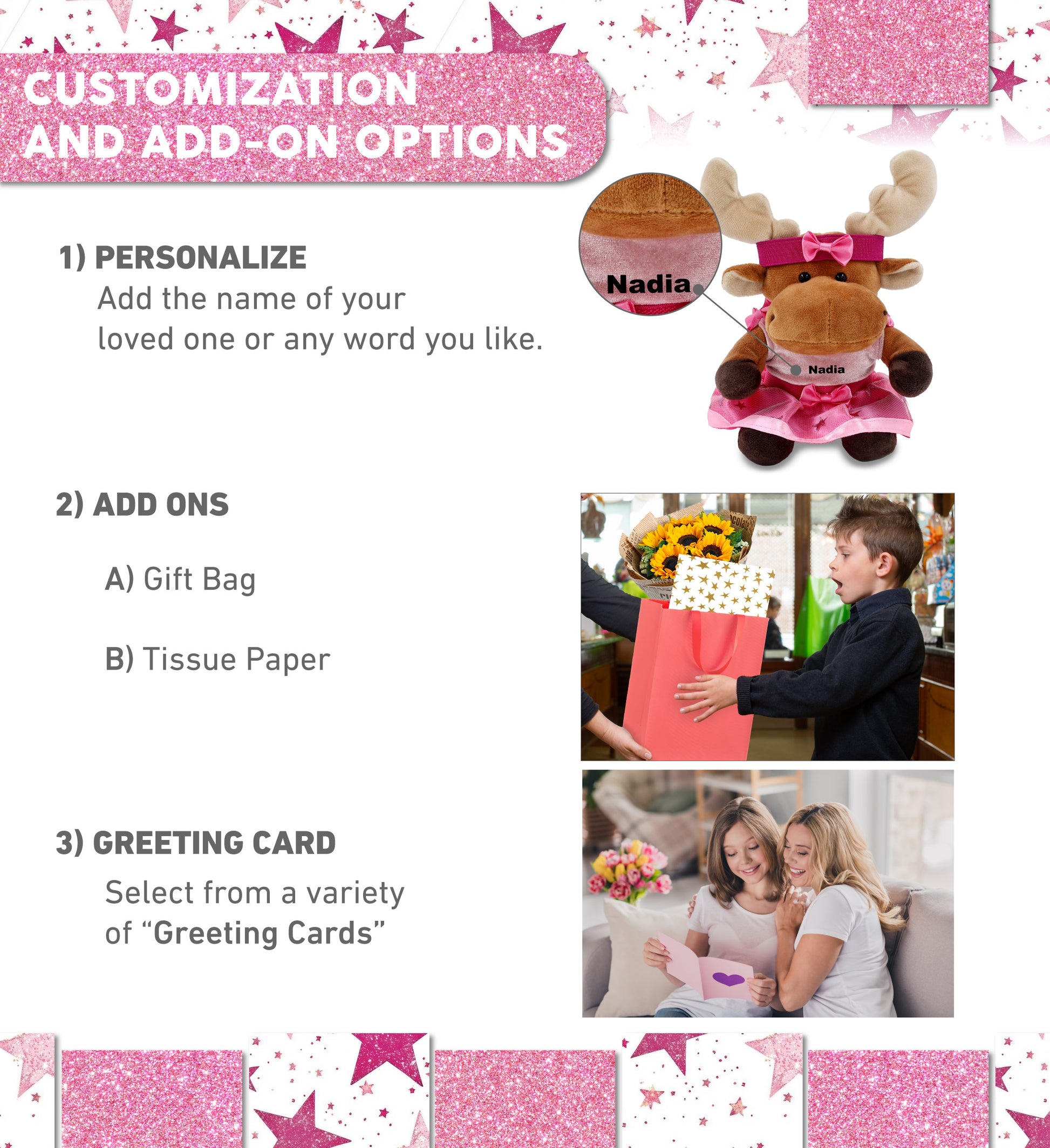 Personalization, Customization, and Add-On Options - The moose plush toy comes dressed in a charming pink ballerina outfit, complete with tutu skirt, headband, and shirt. Make it meaningful by personalizing it with the name, which we will imprint directly onto the plush. You can also customize your ballerina moose stuffed animal doll by adding any of our add-ons to create the perfect gift: 1) Gift Bag 2) Tissue Paper 3) Greeting Card.