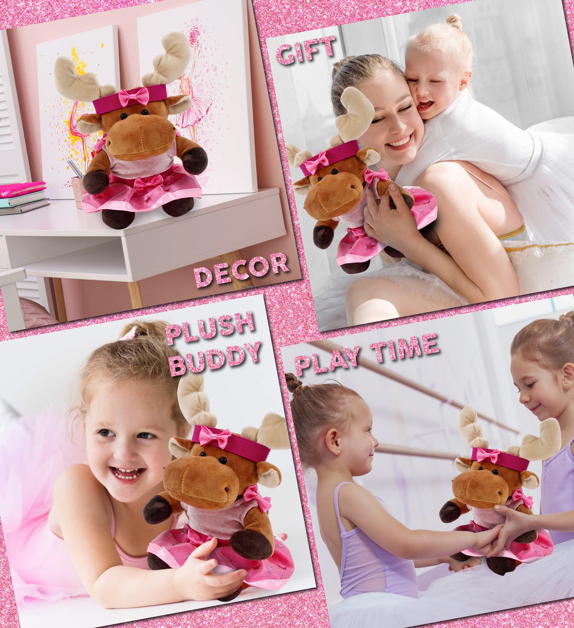 Ballerina-Themed Stuffed Animal Moose Doll Features a Unique Combination of Animals and Ballet - It features a cute moose plush with adorable pink ballerina clothes. The stuffed animal moose plush toy features a soft plush all over and a set of pink ballerina dress complete with a pink ribbon headband, tutu skirt, and a sleeveless top, making it a cute ballerina stuffy doll little dancers will enjoy to play and collect,