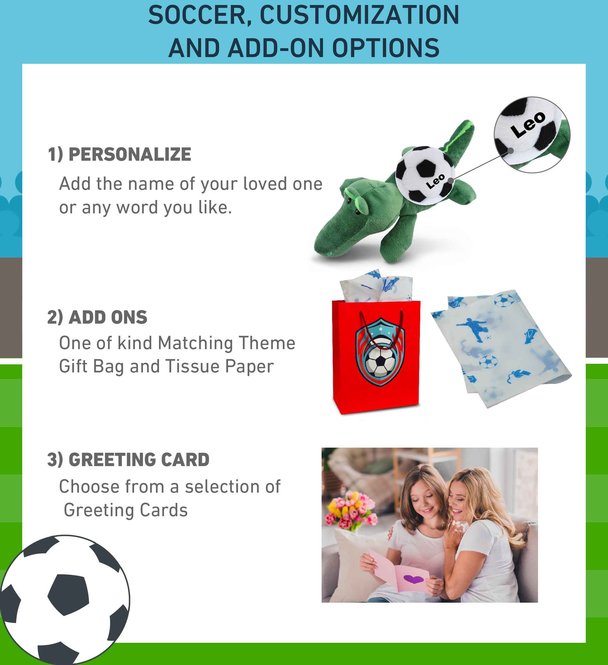PERSONALIZATION, CUSTOMIZATION, AND ADD-ON OPTIONS - Super Soft Sports Stuffed Animal Alligator comes customized with a Soccer Ball Plush. You can personalize it with the name of your loved one imprinted on the item. You also have the option to add some or all of the cool add-ons to make your gift extra special: 1) Gift Bag; 2) Tissue Paper; 3) Greeting Card.