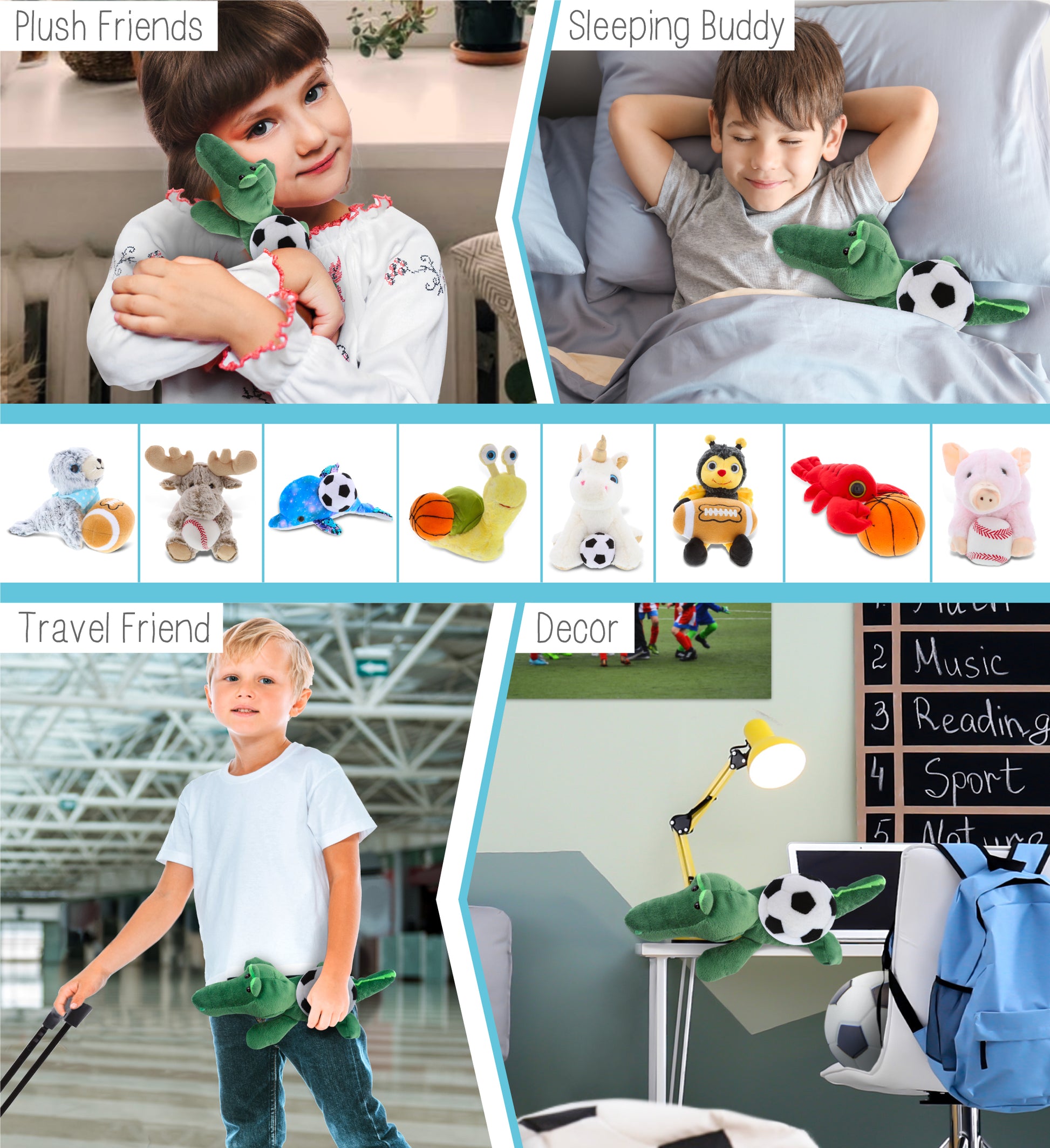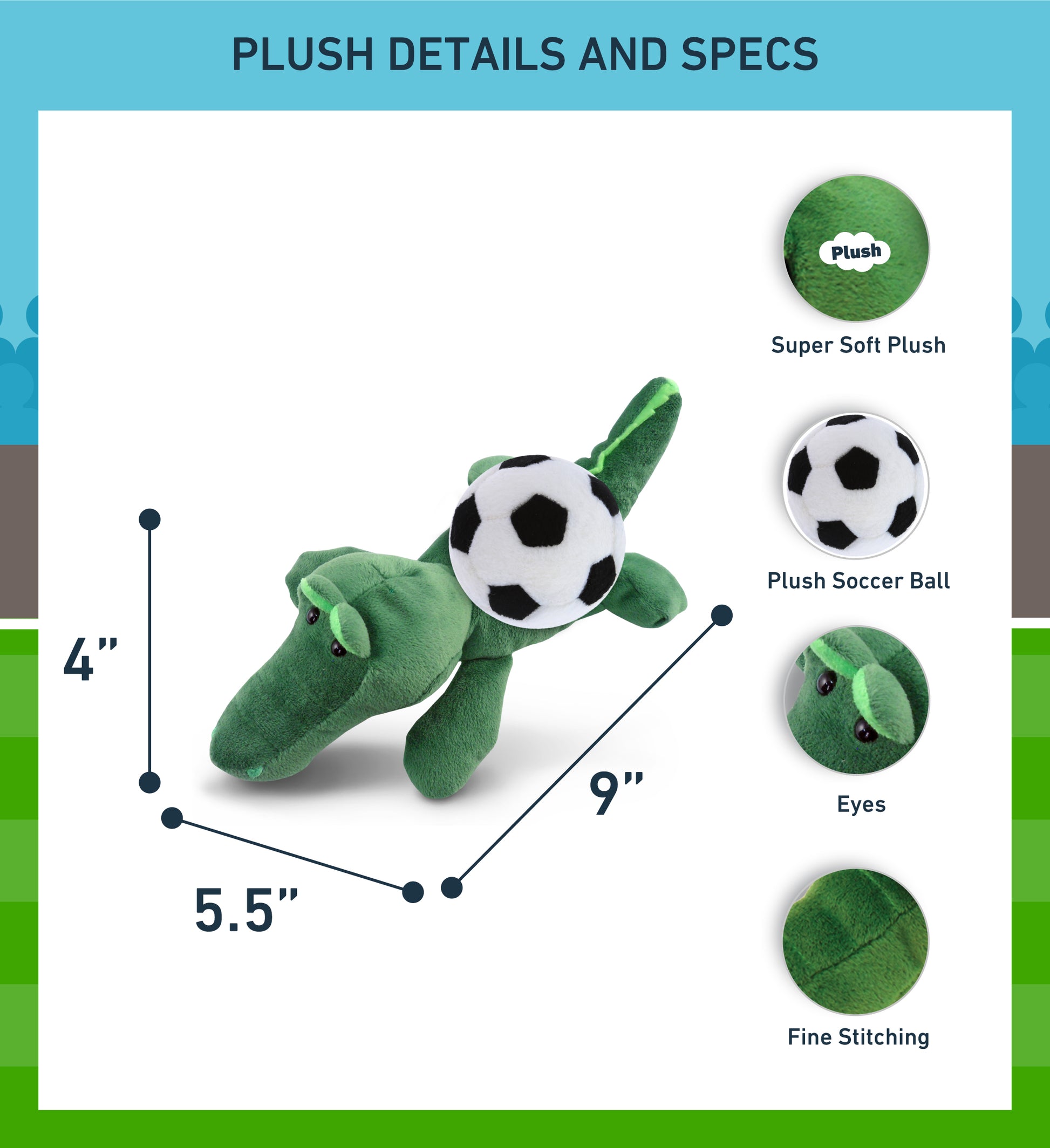 HIGH QUALITY SUPER SOFT PLUSH STUFFED ANIMAL - The machine-sewn alligator toy plush and soccer ball is made of premium-quality polyester, stuffed with soft fluffy polyester fillings. Made with durable and child-friendly features. A cute and snuggly green alligator. Cute soft toys designed to be your little one's best buddies. To maintain fluffy stuffed animals, wash alligator plush toys with cold soapy water and allow it to air dry.