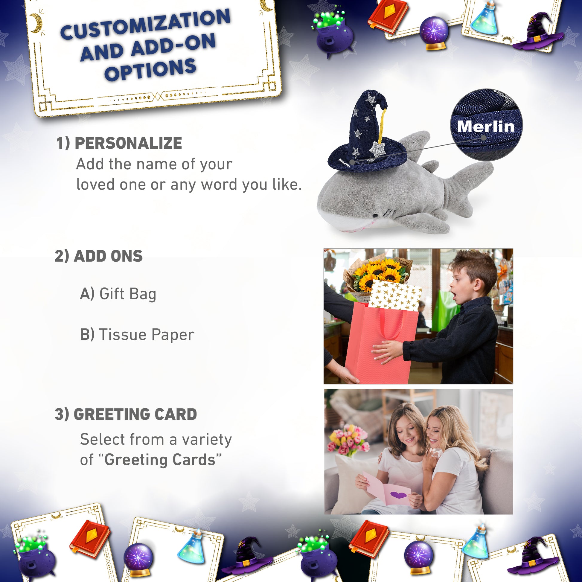 Personalization, Customization, and Add-On Options - The shark stuffed animal comes in an enchanting wizard hat with silver star details. Make your wizard stuffed shark special by adding a personalized name, which we will imprint onto the plush. You can customize your plush wizard toy by adding any of our add-ons to create the perfect gift: 1) Gift Bag 2) Tissue Paper 3) Greeting Card.