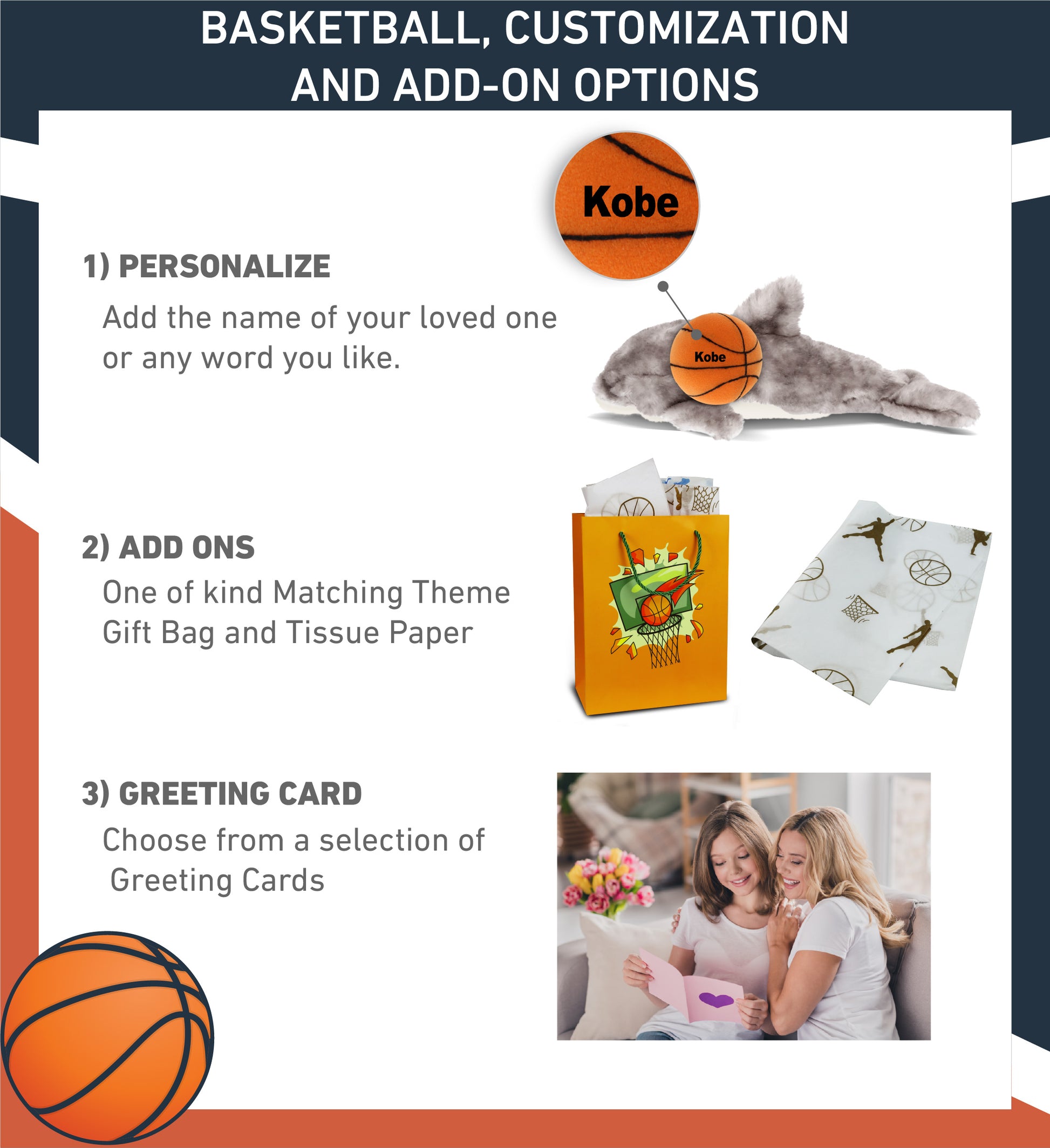 Personalization, Customization, and Add-on Options - The Super Soft Sports Stuffed Animal Grey Dolphin comes customized with a basketball plush. You can personalize your dolphin plush toy with the name of your loved one, which we will imprint on the item. You also have the option to add some or all of the cool add-ons to make your plush gift extra special: 1) Gift Bag; 2) Tissue Paper; 3) Greeting Card.