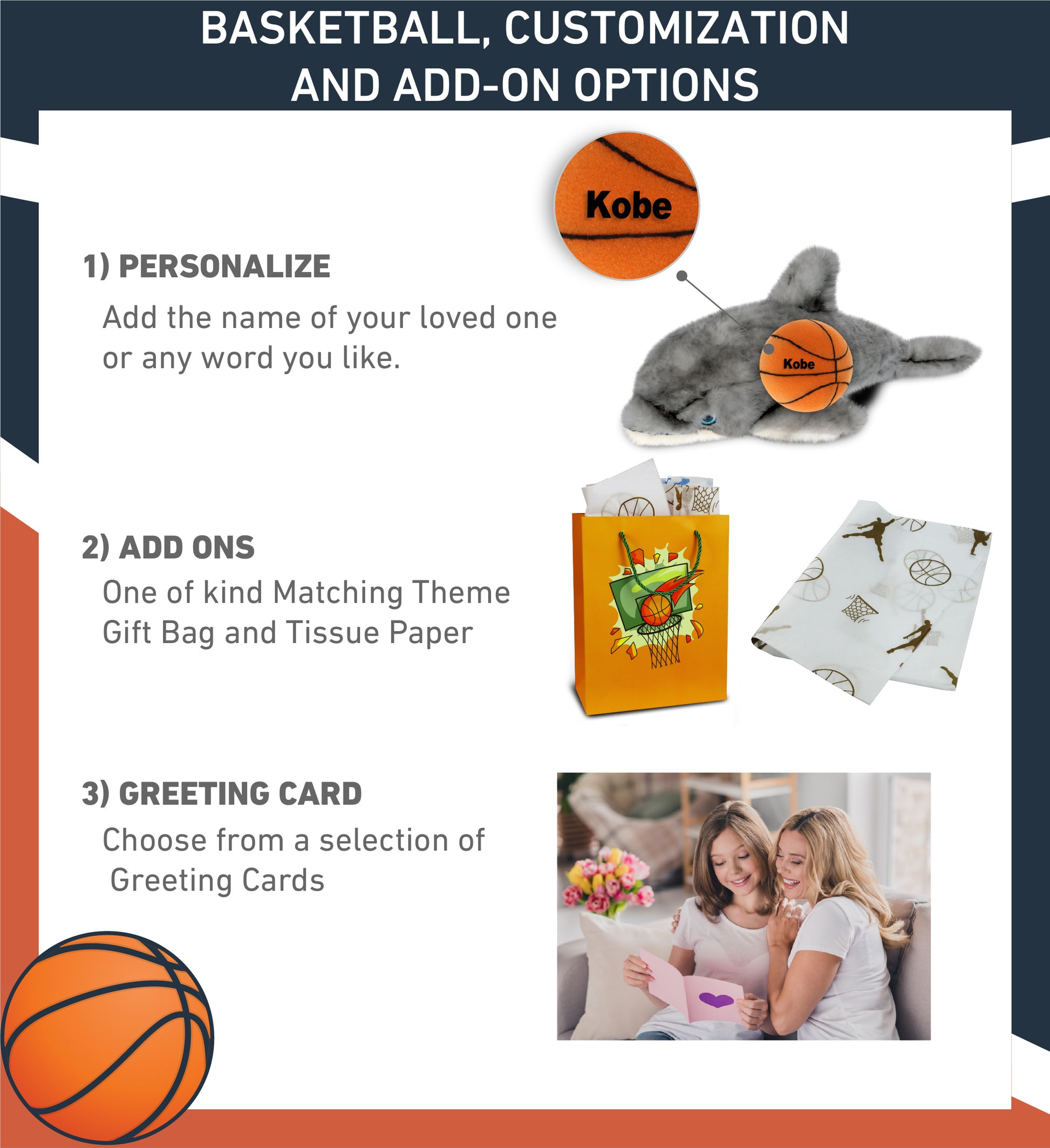 Personalization, Customization, and Add-on Options - The Super Soft Sports Stuffed Animal Grey Dolphin comes customized with a basketball plush. You can personalize your dolphin plush toy with the name of your loved one, which we will imprint on the item. You also have the option to add some or all of the cool add-ons to make your plush gift extra special: 1) Gift Bag; 2) Tissue Paper; 3) Greeting Card.