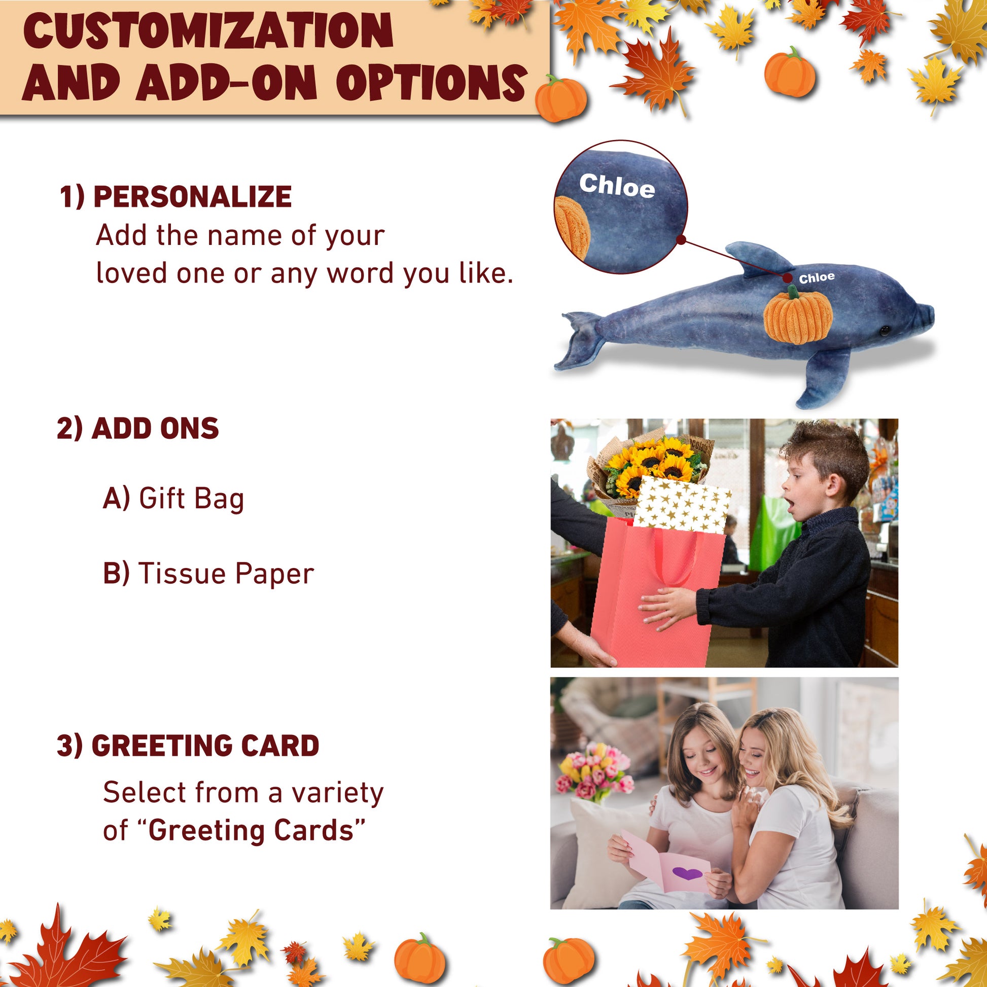 Personalization, Customization, and Add-On Options - The Wild Collection Dolphin Halloween stuffed animal comes customized with a small pumpkin plush toy. You can personalize your plush dolphin with the name of a loved one, or add any word which we will imprint on the item. You also have the option to add some or all of the cool add-ons to make your gift extra special: 1) Gift Bag 2) Tissue Paper 3) Greeting Card.