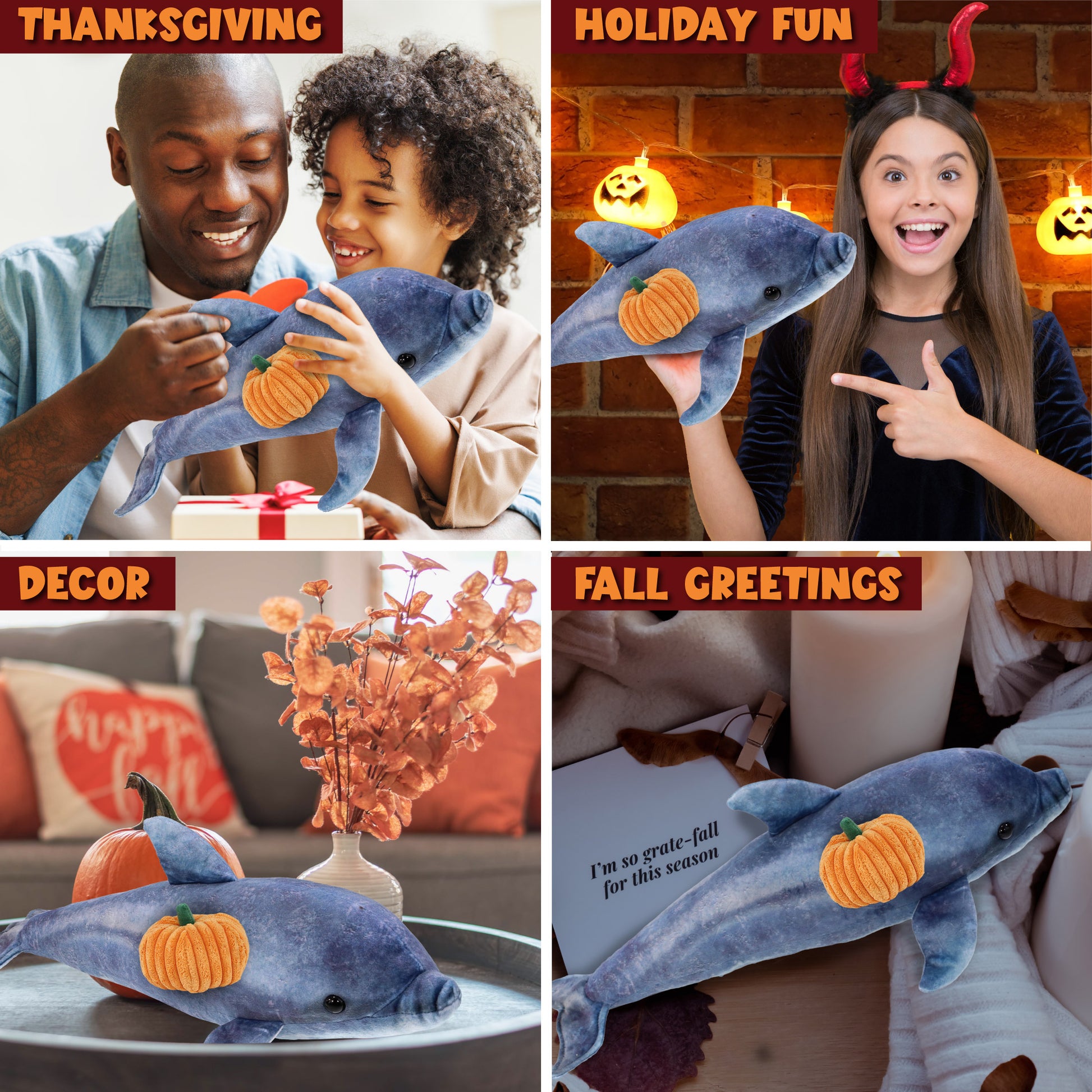 DolliBu Wild Collection Dolphin Stuffed Animal with Pumpkin Decor and Name Personalization - Dolphin Plush Animal for Fall, Halloween and Thanksgiving, Pumpkin Toy for Baby, Kids, Adults - 19 Inches