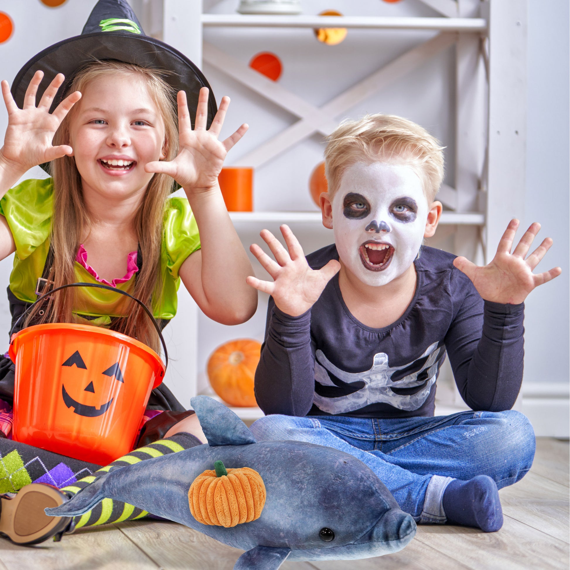 The Dolphin Pumpkin Plush Toy Is for Everyone Who Loves Halloween Toys - The Super Soft Dolphin stuffed animal pumpkin plush toy designed with fall plush theme makes for sweet Halloween kids gifts, babys first Halloween gift and Thanksgiving gifts for friends and family. Welcome spooky month and share the fun of trick-or-treating with loved ones by gifting them a cute custom stuffed animal dolphin plush doll with a pumpkin soft toy.