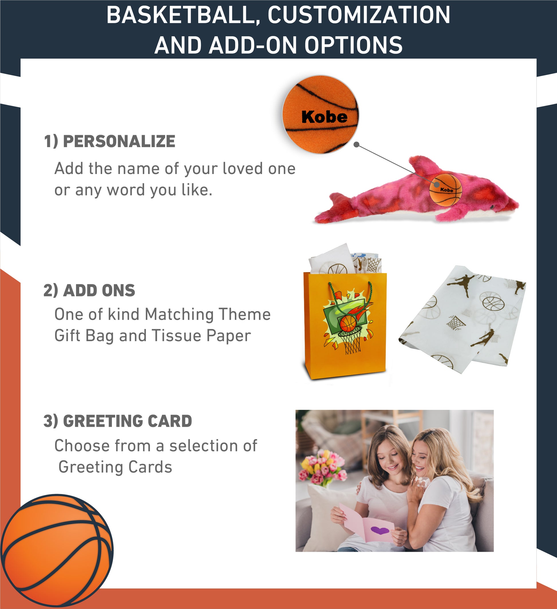 Personalization, Customization, and Add-on Options - The Super Soft Sports Stuffed Animal Pink Tie-Dye Dolphin comes customized with a basketball plush. You can personalize your dolphin plush toy with the name of your loved one, which we will imprint on the item. You also have the option to add some or all of the cool add-ons to make your plush gift extra special: 1) Gift Bag; 2) Tissue Paper; 3) Greeting Card.