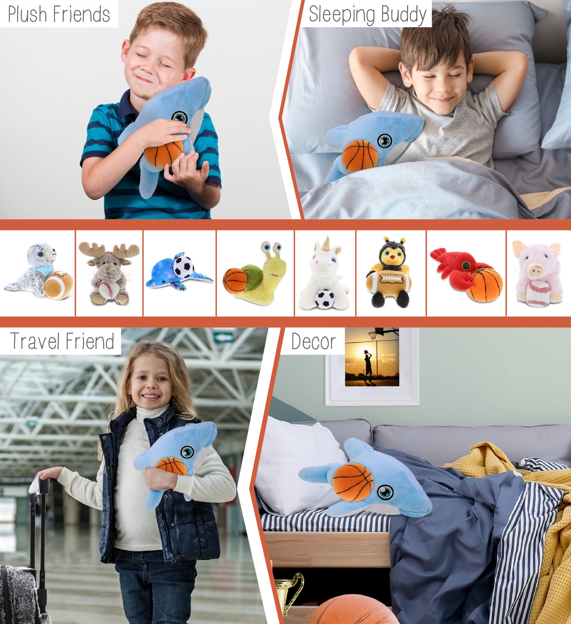 Included with the Purchase of Adorable Cute Dolphin Plush - Includes 1 DolliBu Super Soft Eco-Friendly Dolphin with a basketball plush, decorated with realistic features of a cute plush animal. The body with a sports gift ball plush makes the plush perfect for cuddles. The dolphin plush toy features details like its characteristic fins. The dolphin eyes make the critter so charming. The plush toy buddy measures 13.5Lx8.5Wx5.5H inches.