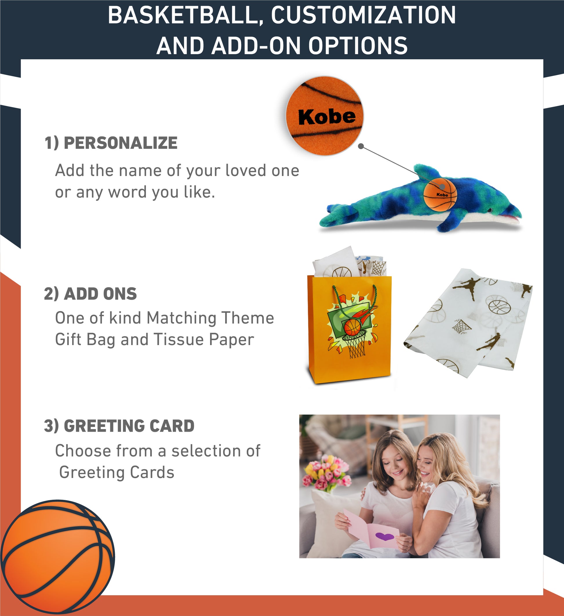 Personalization, Customization, and Add-on Options - The Super Soft Sports Stuffed Animal Blue Tie-Dye Dolphin comes customized with a basketball plush. You can personalize your dolphin plush toy with the name of your loved one, which we will imprint on the item. You also have the option to add some or all of the cool add-ons to make your plush gift extra special: 1) Gift Bag; 2) Tissue Paper; 3) Greeting Card.