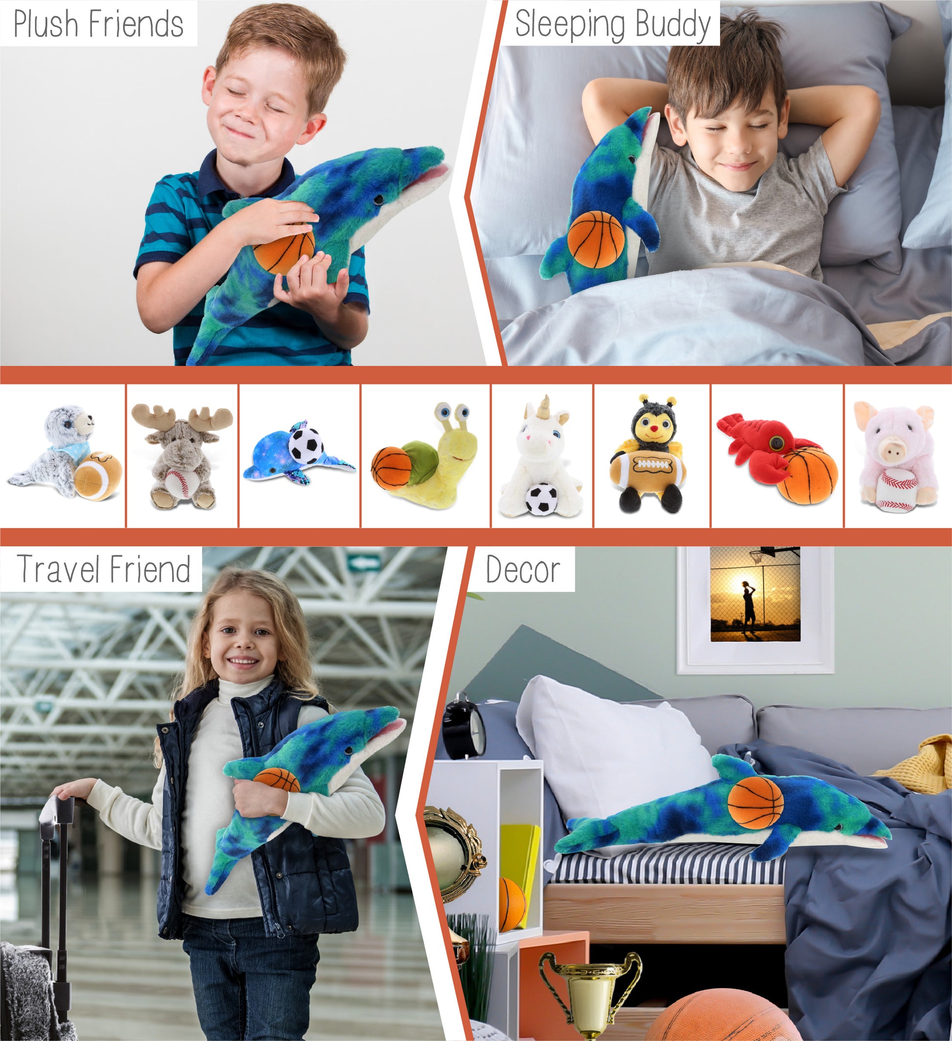 Included with the Purchase of Adorable Cute Dolphin Plush - Includes 1 DolliBu Super Soft BlueTie-Dye Dolphin with a basketball plush, decorated with realistic features of a cute plush animal. The body with a sports gift ball plush makes the plush perfect for cuddles. The dolphin plush toy features details like its characteristic fins. The dolphin eyes make the critter so charming. The plush toy buddy measures 18Lx8.5Wx6H inches.