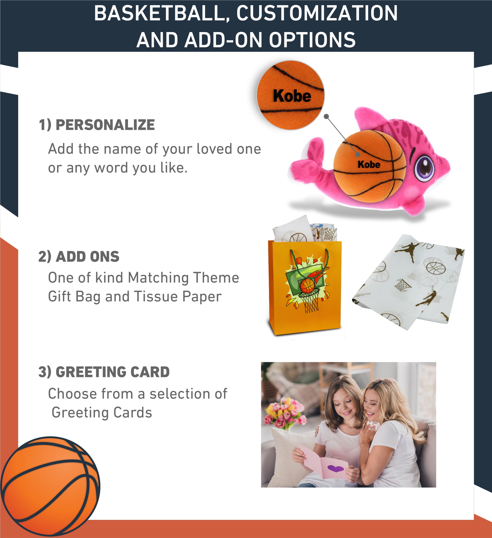 Personalization, Customization, and Add-on Options - The Super Soft Sports Stuffed Animal Plush Buddies Dolphin comes customized with a basketball plush. You can personalize your dolphin plush toy with the name of your loved one, which we will imprint on the item. You also have the option to add some or all of the cool add-ons to make your plush gift extra special: 1) Gift Bag; 2) Tissue Paper; 3) Greeting Card.