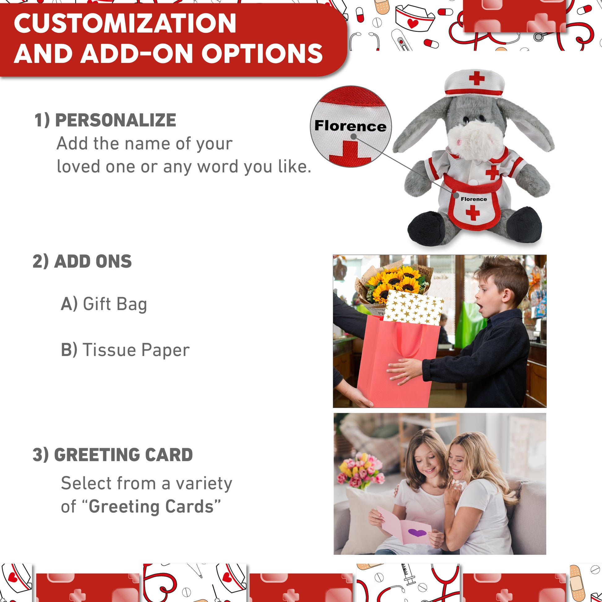 Personalization, Customization, and Add-On Options - The stuffed grey donkey comes dressed in a cute nurse costume, complete with nurse cap, nurse dress and apron. Make your nurse donkey stuffed animal plush special by adding a personalized name, which we'll imprint onto the plush. You can also customize your nurse donkey plush by adding any of our add-ons to create the perfect gift: 1) Gift Bag 2) Tissue Paper 3) Greeting Card.