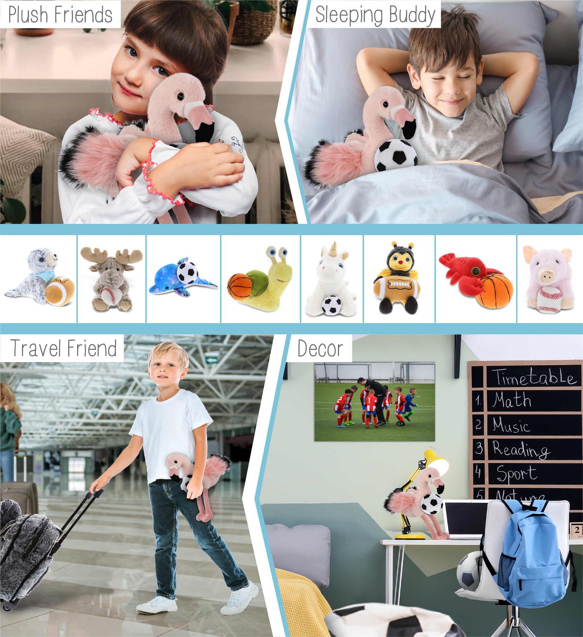 DolliBu Rose Flamingo Super Soft Plush with the plush soccer ball toy is a safe stuffed toy for kids and toddlers of all ages. The plush animal will surely bring a smile to your loved ones who love wild animals, especially flamingos. The rose flamingo plush will make a great addition to a kid's sports plush collection while couples can express their love by surprising their better half with a unique plush. Stuffed animals help develop a child's social skills, speech and creativity when enjoying imaginative playtime with their family. The stuffed flamingo will be your little one's huggable plush doll BFF when playing, traveling, and learning. Anyone will love to receive cute stuffed animals like flamingo toys. Toddler boys and girls love to snuggle with a fuzzy stuffed toy. Soft stuffed animals are classic gifts for loved ones. Makes a sweet present for your partner on occasions like birthday, Valentine's Day, and Christmas. Send your regards to ill children and adults by giving them cute toy stuffed plush as get well presents. Includes 1 DolliBu Rose Flamingo Super Soft Plush with a plush soccer ball, decorated with realistic features of cute flamingo. The flamingo's body is of rose soft fabric that makes the plush perfect for cuddles and snuggles. The eyes make the critter so charming. The machine-sewn flamingo toy plush and soccer ball is made of premium-quality polyester, stuffed with soft fillings. Made with durable and child-friendly features. A huggable and snuggly critter with rose plush all around it. Cute soft toys designed to be your child pet buddies. To maintain fluffy stuffed animals, wash toys with cold soapy water and allow to air dry. A must-have toy for family bonding and to add to your wildlife-themed room decor. Start collecting DolliBu's super cute plush from pets to zoo, ocean, jungle and safari wild animals. The lovely flamingo soft plush toys are perfect for all ages, and it measures 11LX5WX8.5H inches.
