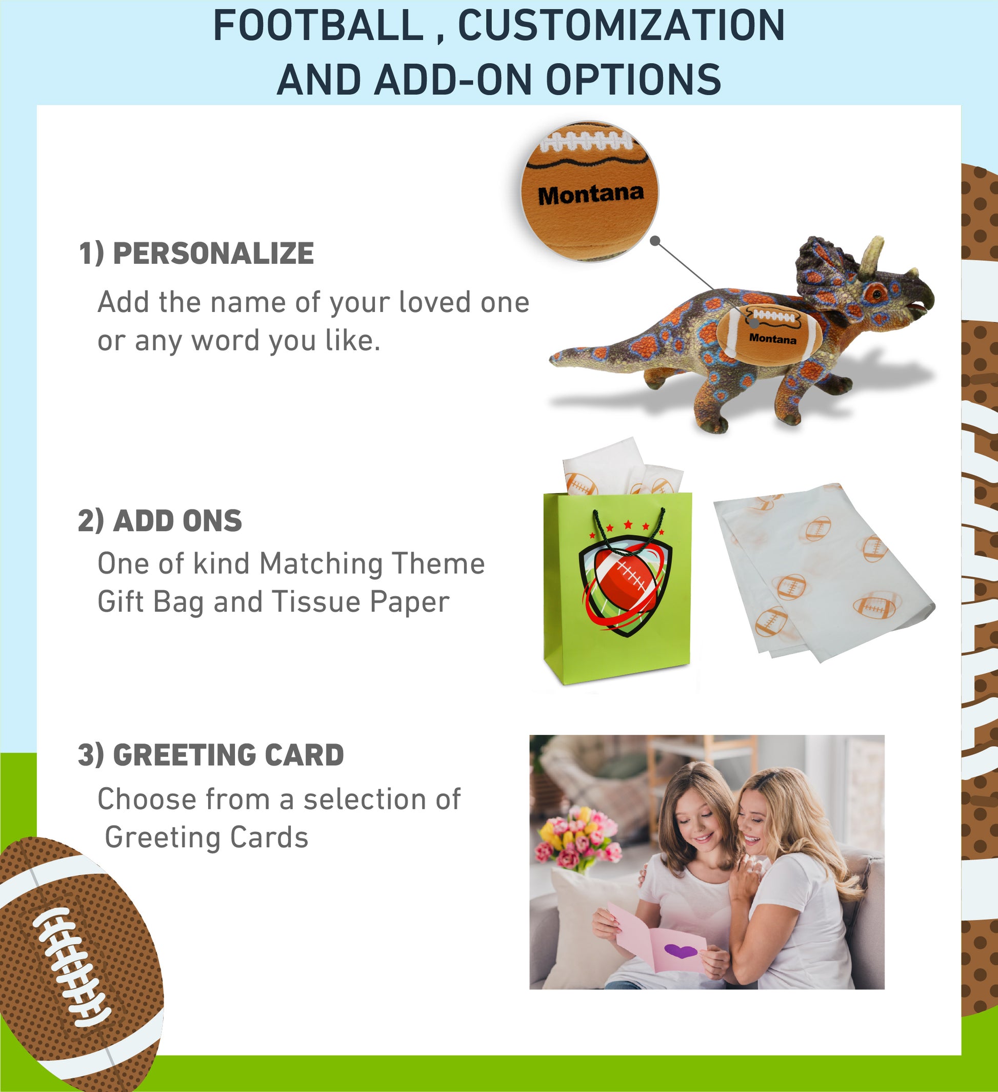 Personalization, Customization, and Add-On Options - This Super Soft Sports Stuffed Animal Wild Collection Triceratops Dinosaur Plush comes customized with a football plush. You can personalize it with the name of your loved one imprinted on the item. You also have the option to add some or all of the cool add-ons to make your gift extra special: 1) Gift Bag; 2) Tissue Paper; 3) Greeting Card.