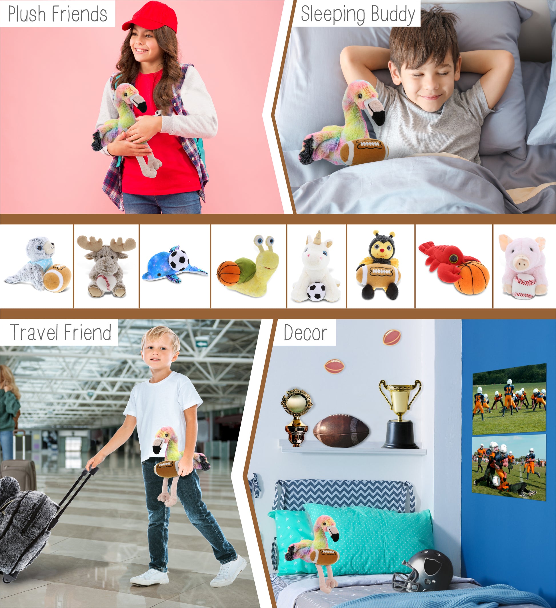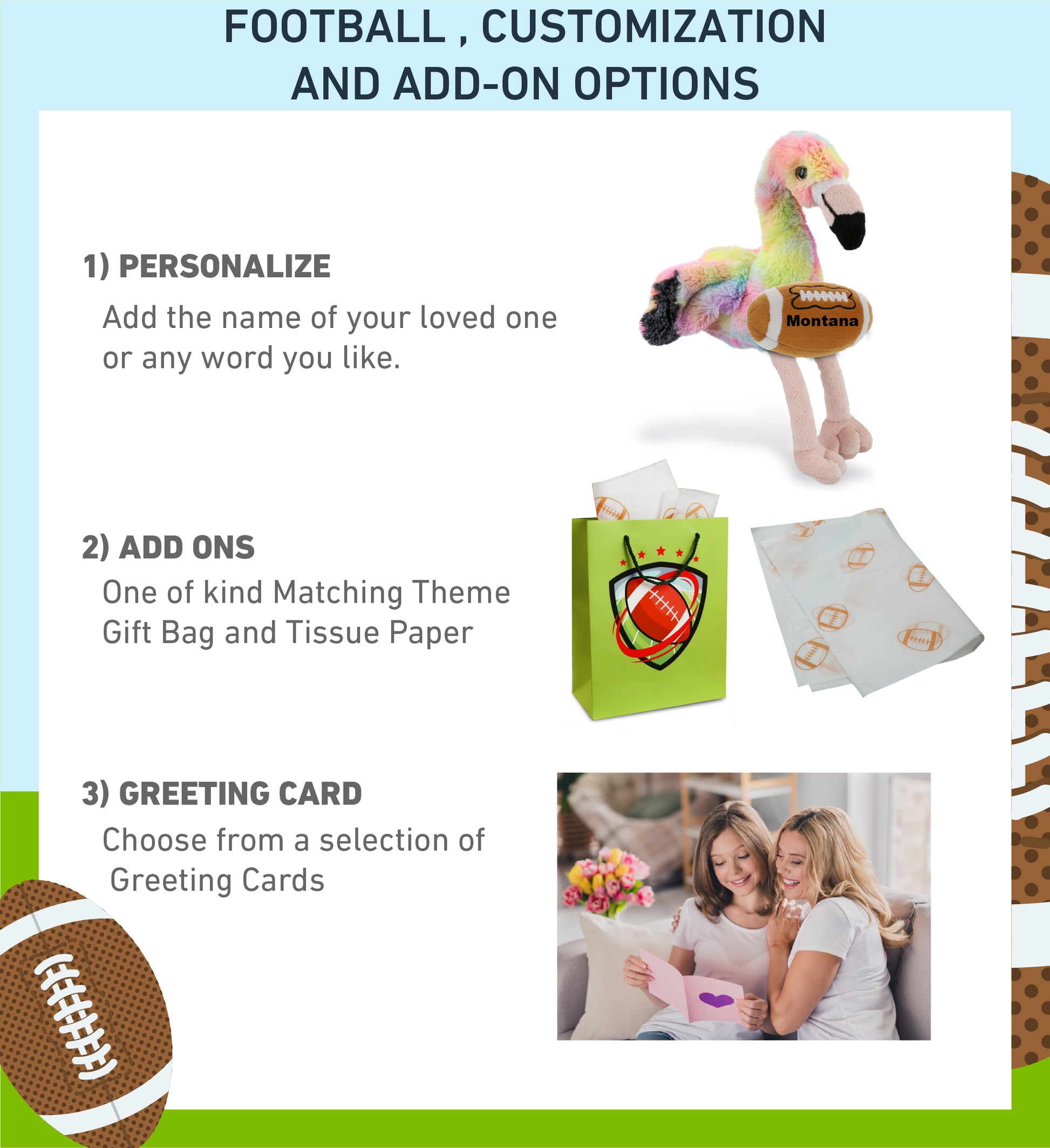PERSONALIZATION, CUSTOMIZATION, AND ADD-ON OPTIONS - Super Soft Sports Stuffed Animal Rainbow Flamingo comes customized with a Football Plush. You can personalize it with the name of your loved one imprinted on the item. You also have the option to add some or all of the cool add-ons to make your gift extra special: 1) Gift Bag; 2) Tissue Paper; 3) Greeting Card.