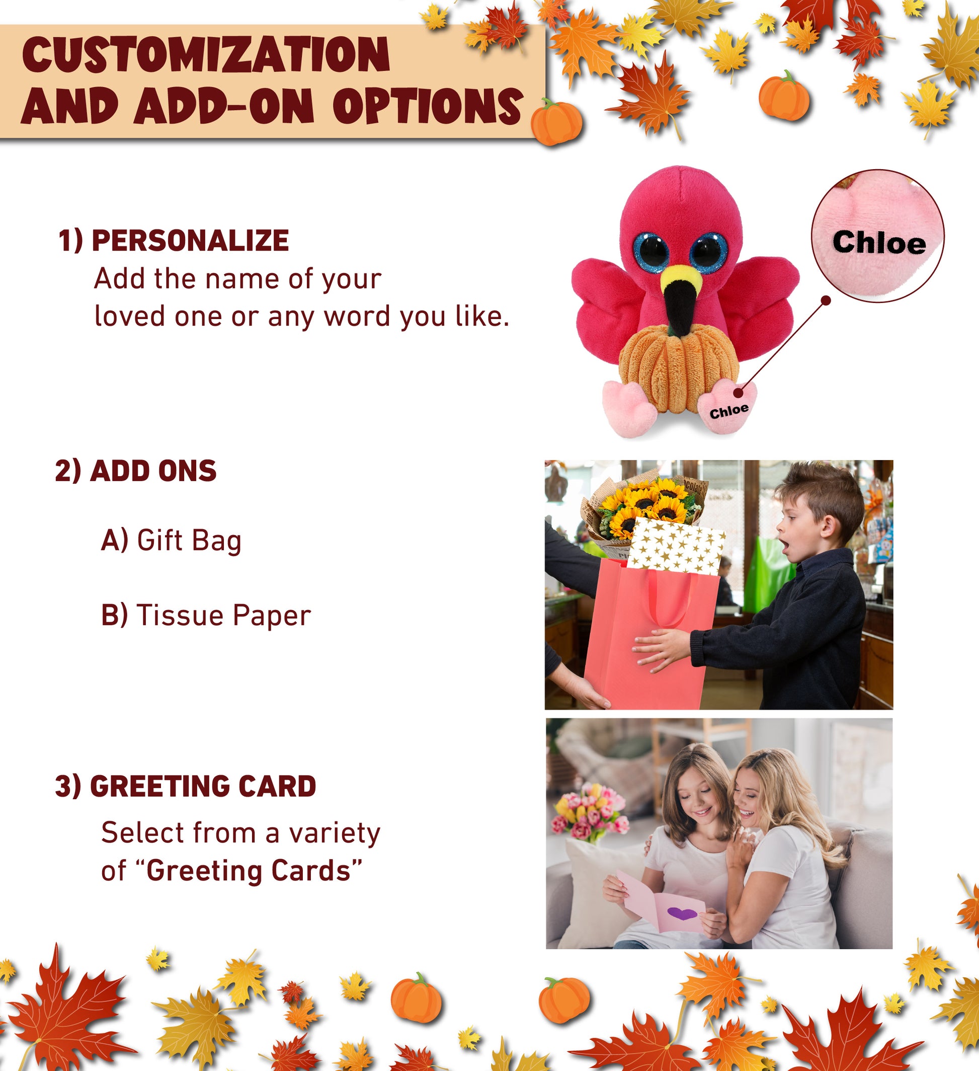 Personalization, Customization, and Add-On Options - The Big Eye Plush Flamingo Halloween stuffed animal comes customized with a small pumpkin plush toy. You can personalize your flamingo plush with the name of a loved one or add any word that we will imprint on the item. You also have the option to add some or all of the cool add-ons to make your gift extra special: 1) Gift Bag 2) Tissue Paper 3) Greeting Card.