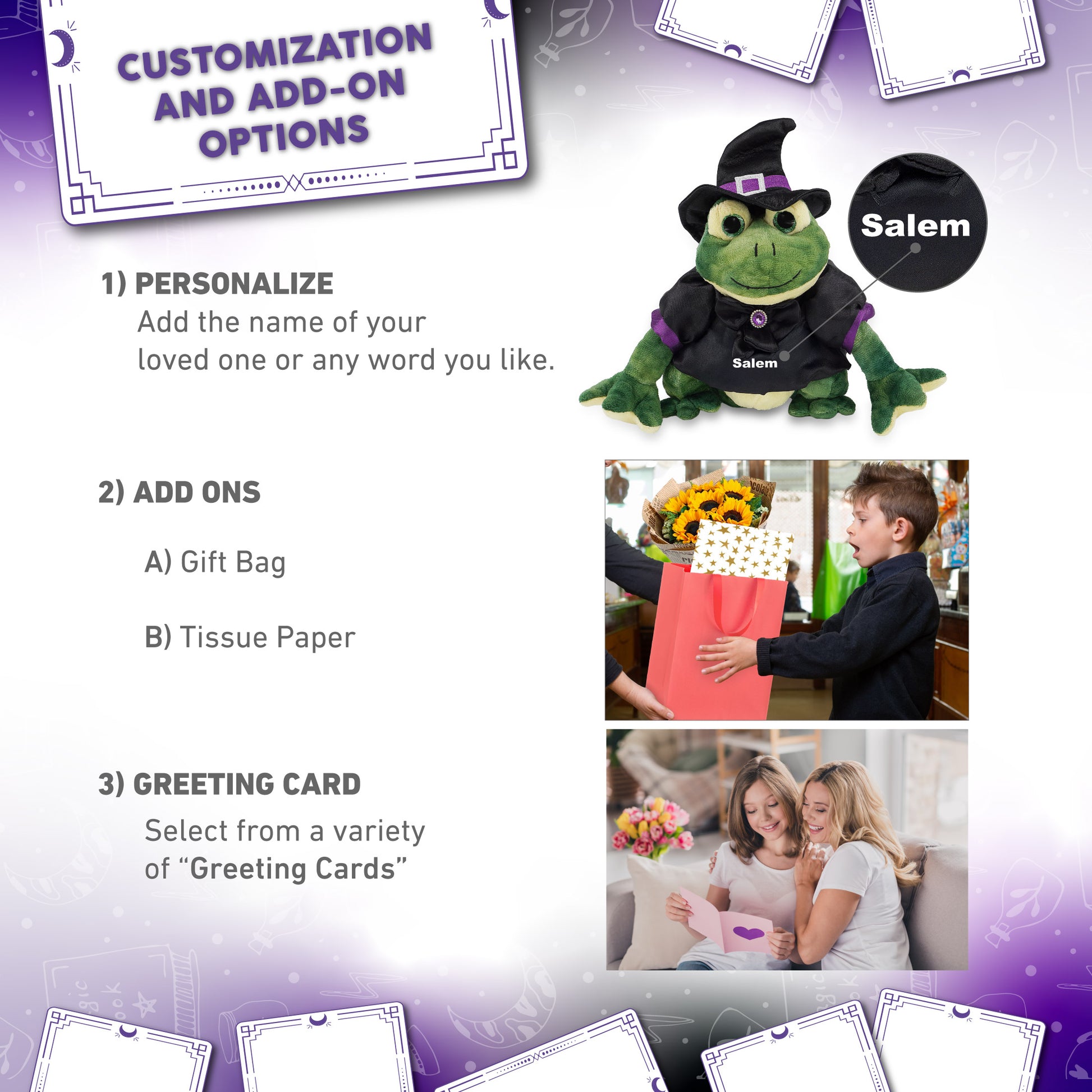 Personalization, Customization, and Add-On Options - The frog Halloween plush toy comes dressed in a witch outfit, complete with black and purple cloak and pointy black witch hat. Make your teddy bear doll special by adding a personalized name, which we will imprint onto the plush. You can also customize your witch frog stuffed animal by adding any of our add-ons to create the perfect gift: 1) Gift Bag 2) Tissue Paper 3) Greeting Card.