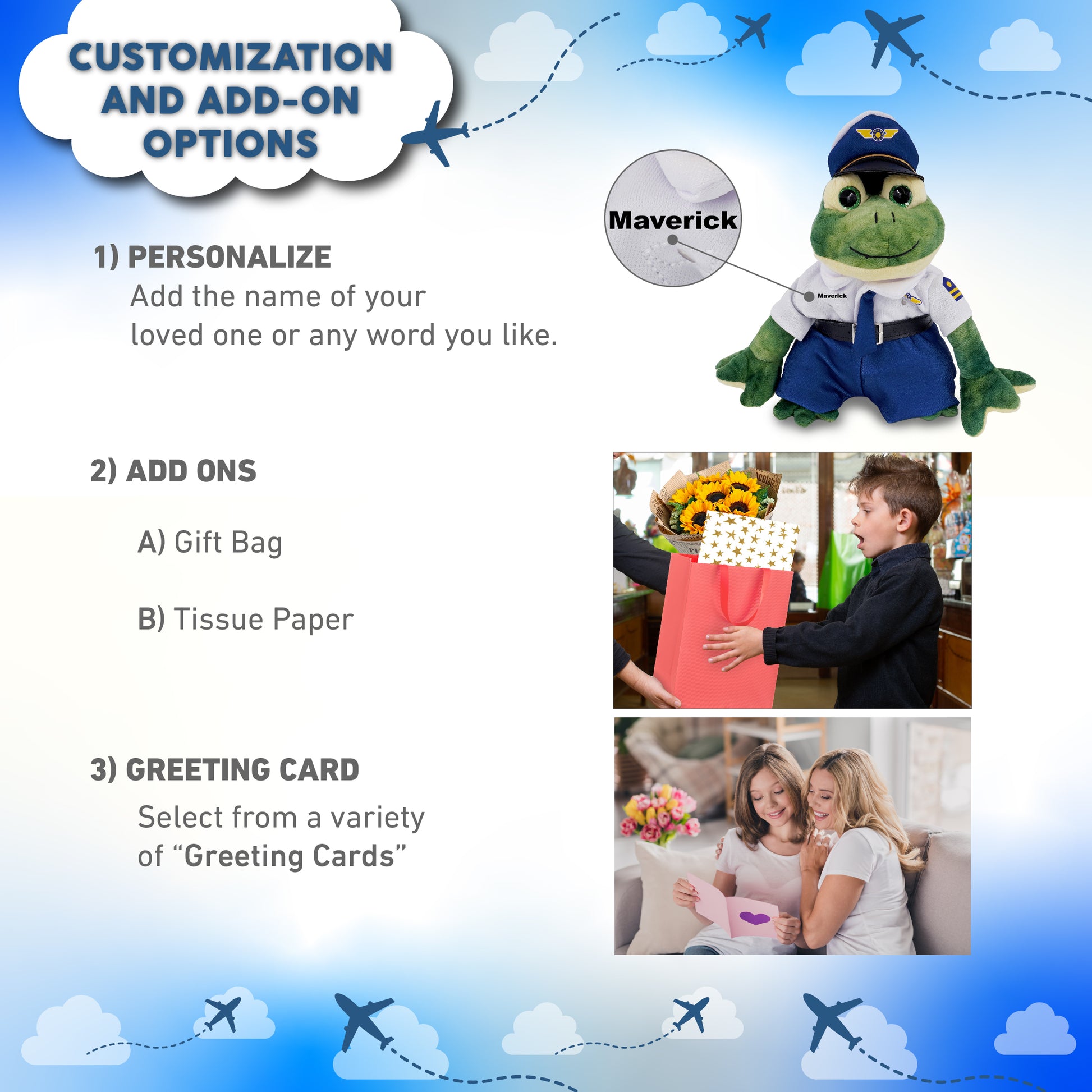Personalization, Customization, and Add-On Options - The frog stuffed animal comes dressed in a full pilot outfit set, with a white pilot shirt, captain hat, belt, and pants. Make your pilot stuffed bear special by adding a personalized name, which we will imprint onto the plush. You can customize your plush pilot toy by adding any of our add-ons to create the perfect gift: 1) Gift Bag 2) Tissue Paper 3) Greeting Card.
