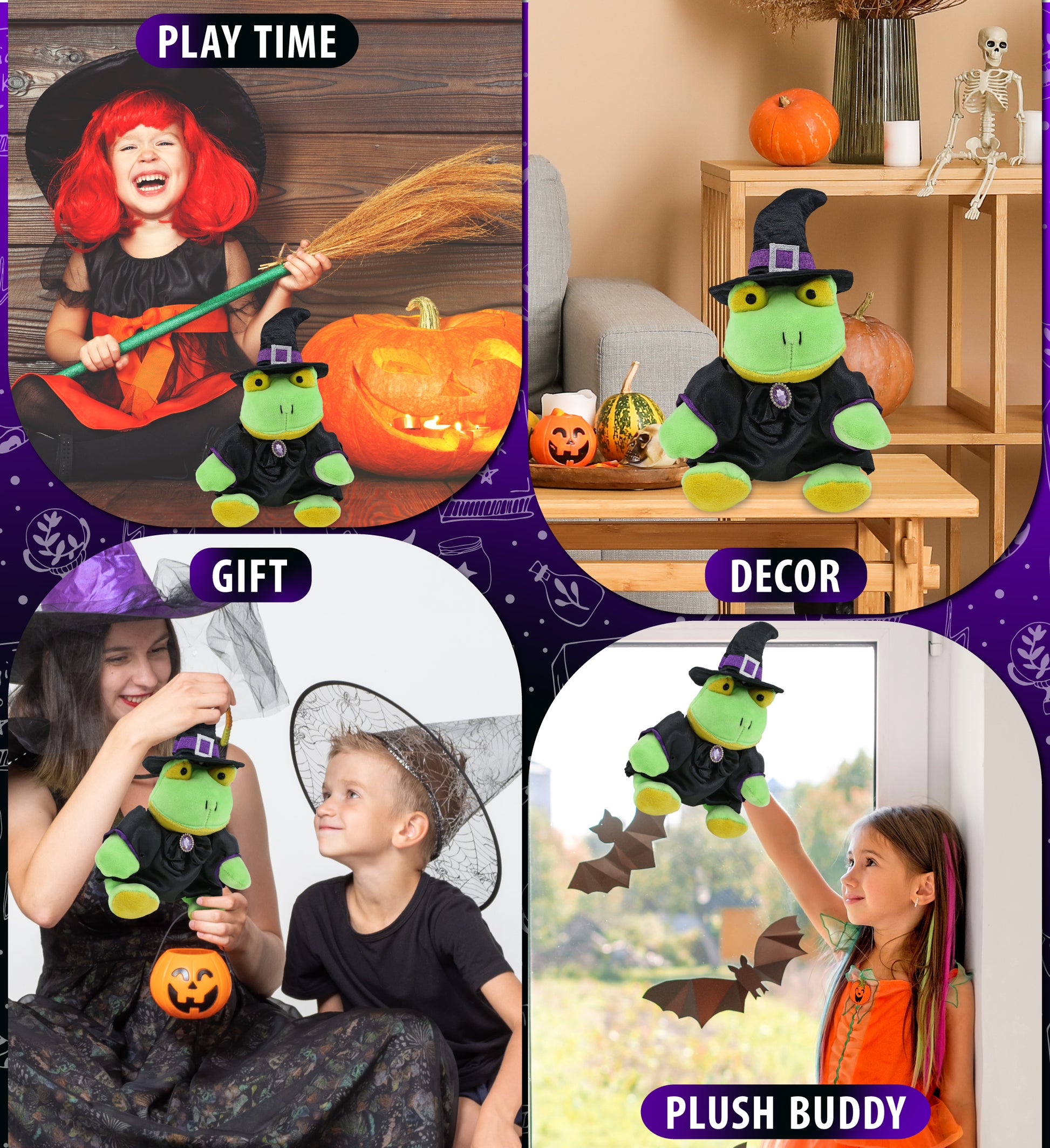 Features a Teddy Bear Halloween Plush Wearing Witch Plush Doll Clothes - This cute witch frog stuffed toy comes dressed in a soft black satin witch doll dress with purple trim and a shiny gem-accented bow. It also wears a pointy black witch hat decor with a silver buckle and purple band, completing the spooky Halloween teddy bear look. The frog plush toy witch costume is removable and fits snugly on the frog Halloween witch doll.