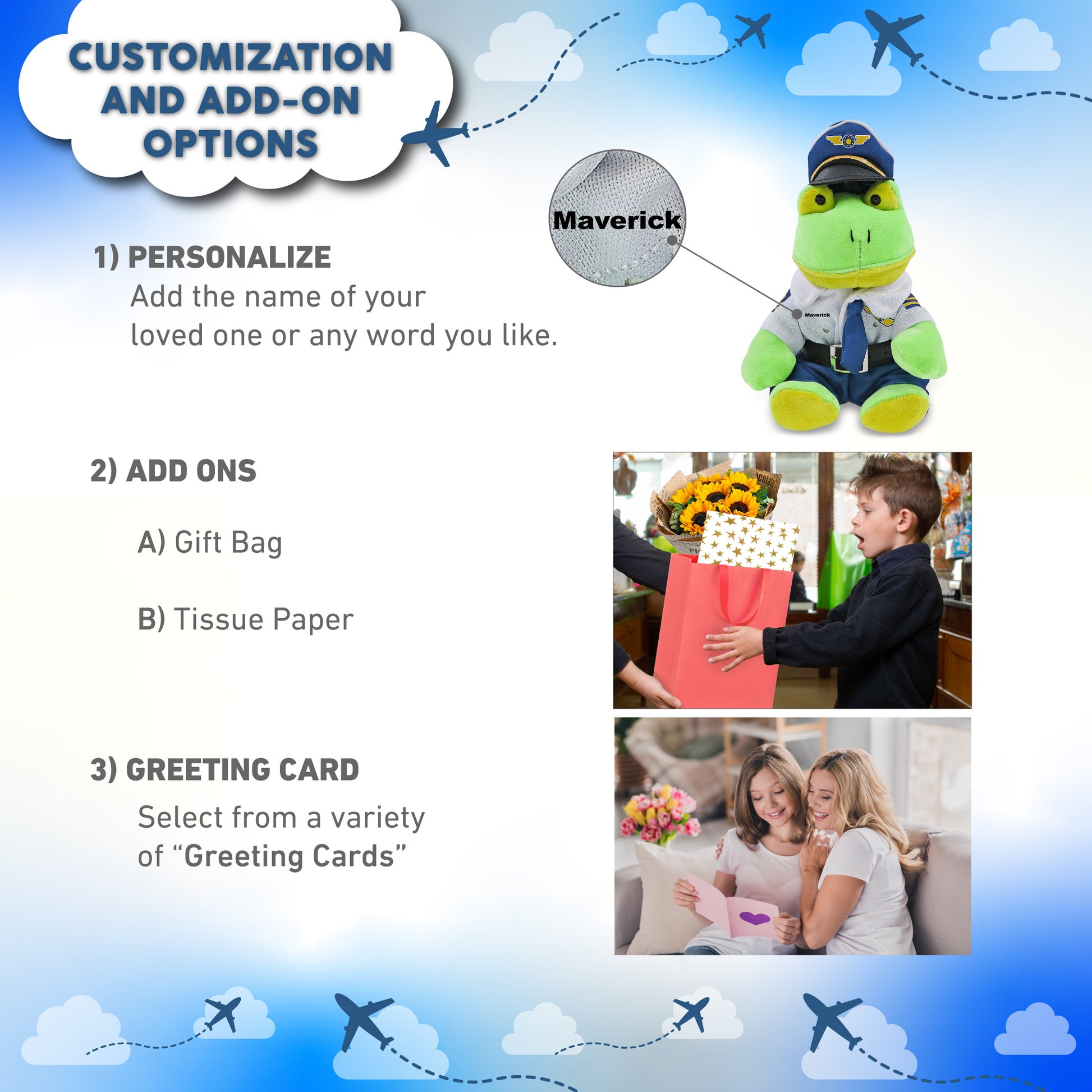 Personalization, Customization, and Add-On Options - The frog stuffed animal comes dressed in a full pilot outfit set, with a white pilot shirt, captain hat, belt, and pants. Make your pilot stuffed bear special by adding a personalized name, which we will imprint onto the plush. You can customize your plush pilot toy by adding any of our add-ons to create the perfect gift: 1) Gift Bag 2) Tissue Paper 3) Greeting Card.
