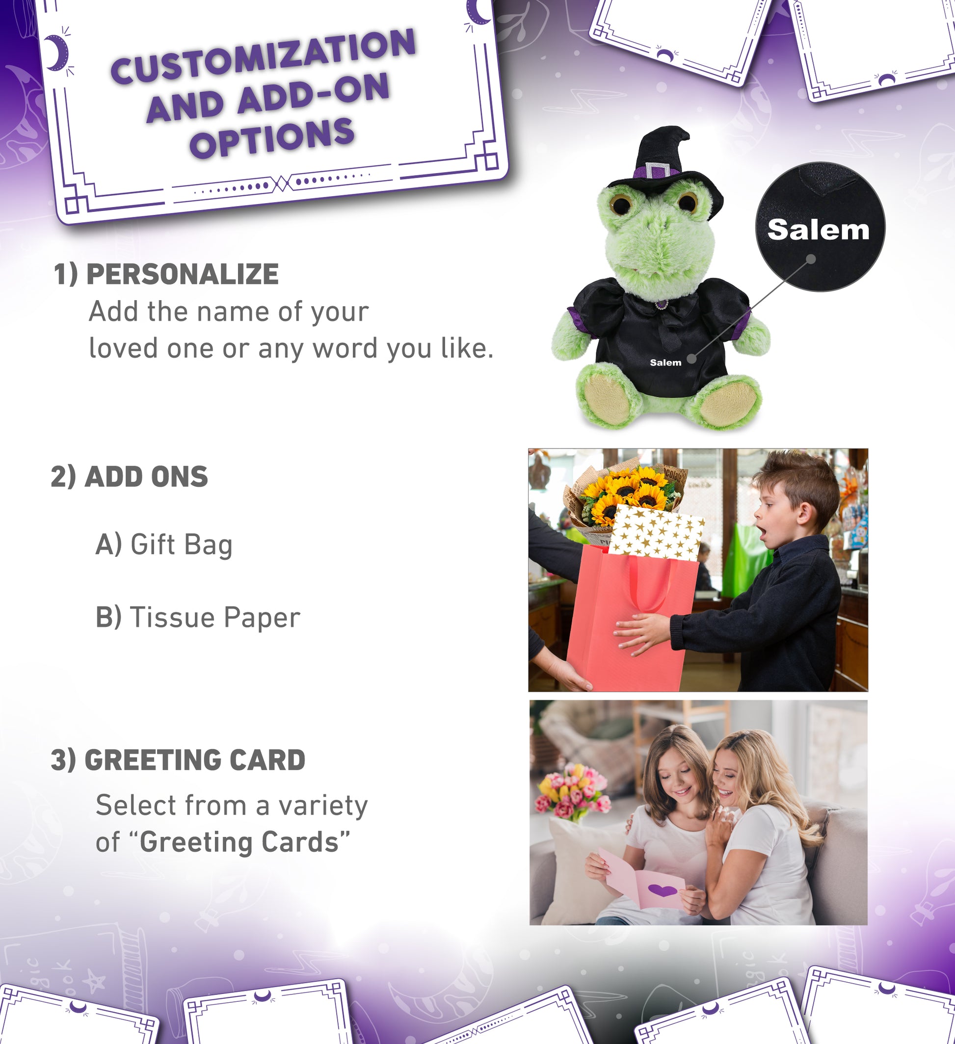 Personalization, Customization, and Add-On Options - The frog Halloween plush toy comes dressed in a witch outfit, complete with black and purple cloak and pointy black witch hat. Make your teddy bear doll special by adding a personalized name, which we will imprint onto the plush. You can also customize your witch frog stuffed animal by adding any of our add-ons to create the perfect gift: 1) Gift Bag 2) Tissue Paper 3) Greeting Card.