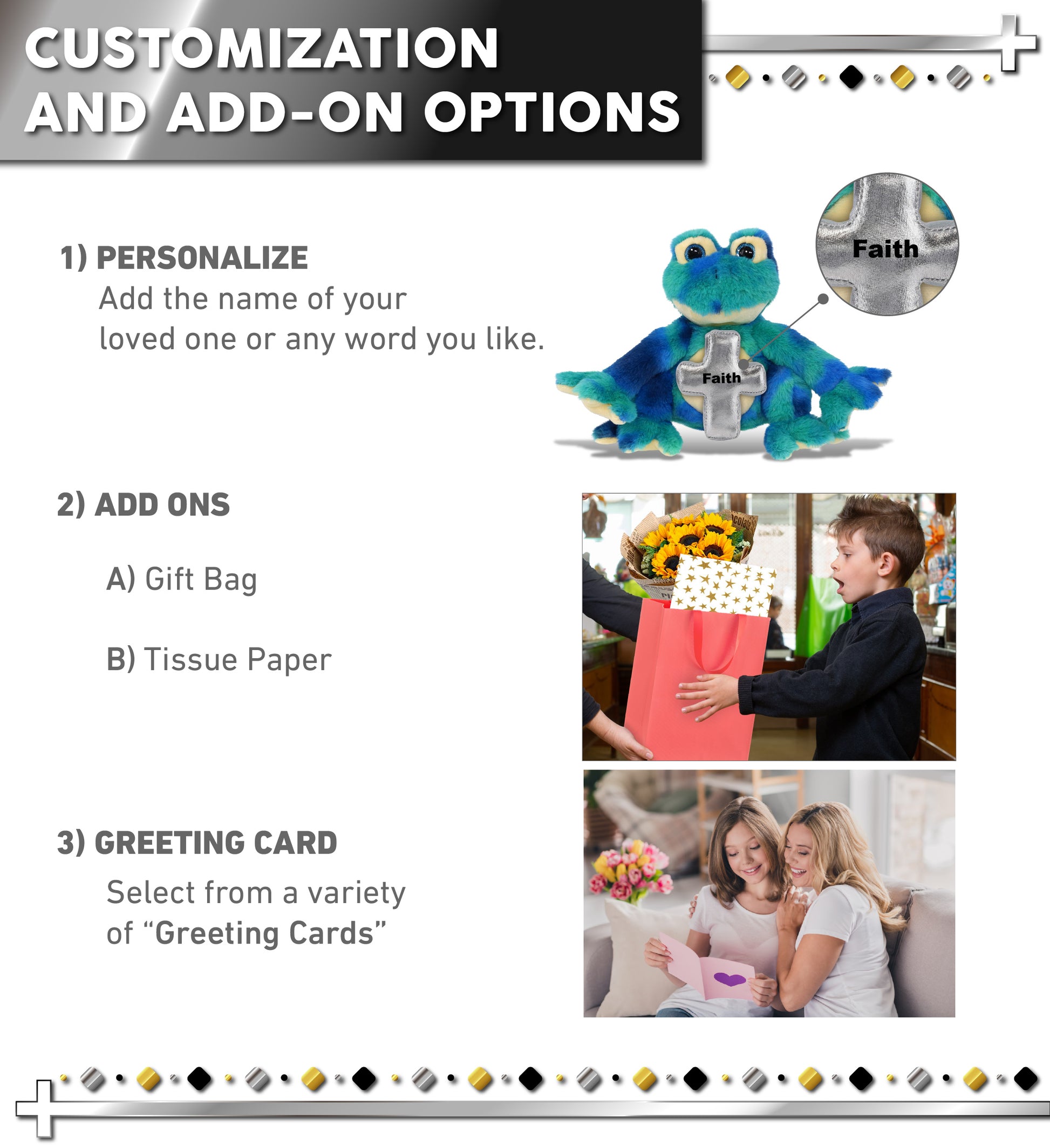 Personalization, Customization, and Add-On Options - Super Soft Blue Tie-Dye Frog stuffed animal bear comes customized with a shiny metallic cross. You can turn it into a personalized teddy bear with the name of a loved one, or add any word which we will imprint on the item. And last, you have the option to add some or all of the cool add-ons to make your gift extra special: 1) Gift Bag 2) Tissue Paper 3) Greeting Card.