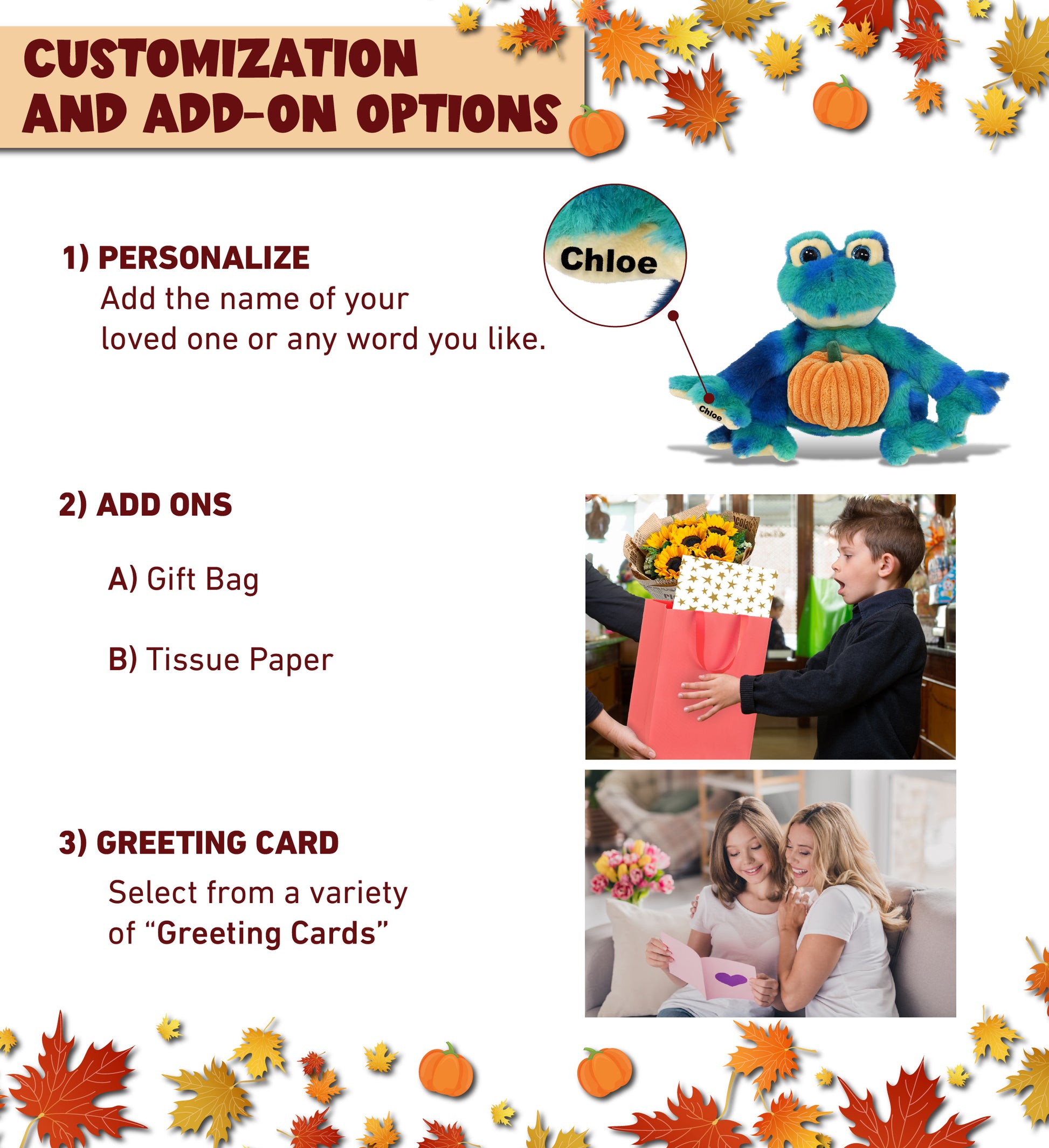 Personalization, Customization, and Add-On Options - Super Soft Blue Tie-Dye Frog Halloween stuffed animal comes customized with a small pumpkin plush toy. You can personalize your frog with the name of a loved one, or add any word which we will imprint on the item. You also have the option to add some or all of the cool add-ons to make your gift extra special: 1) Gift Bag 2) Tissue Paper 3) Greeting Card.